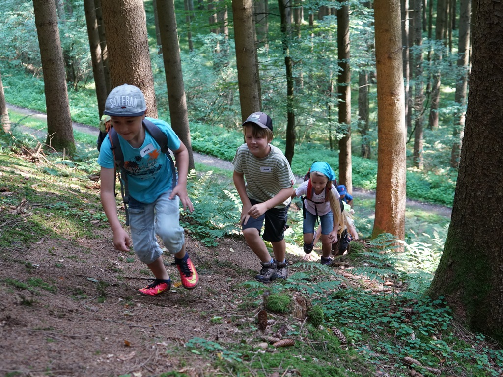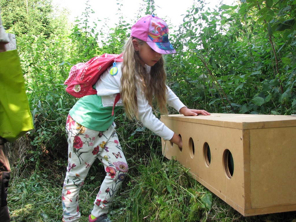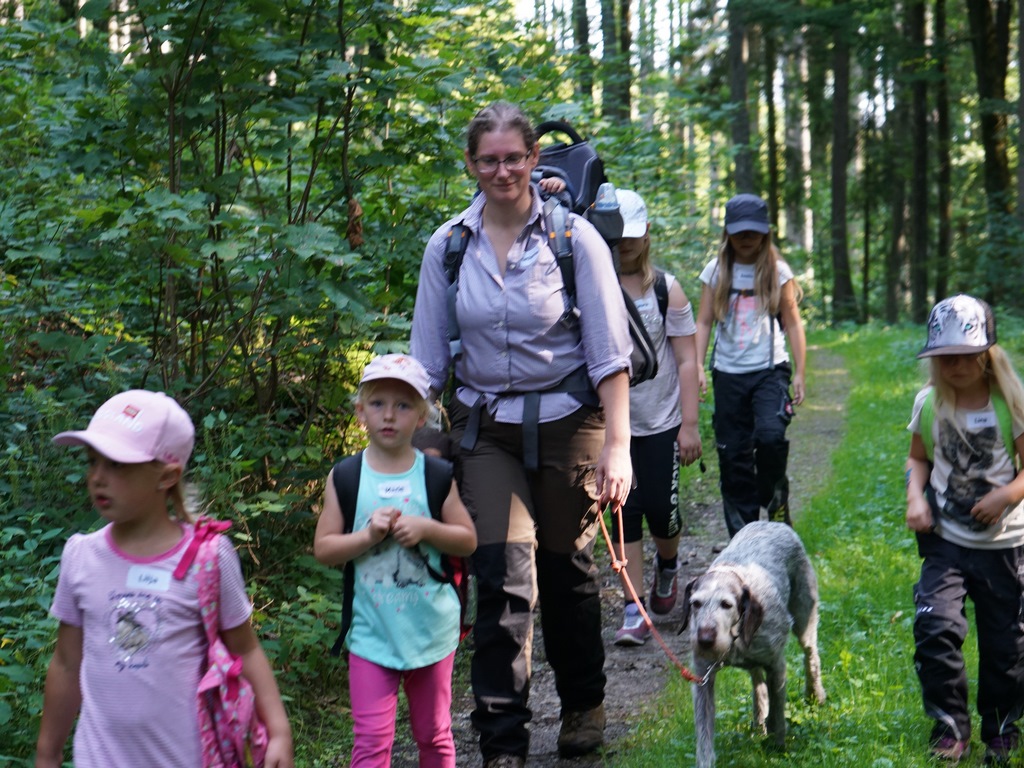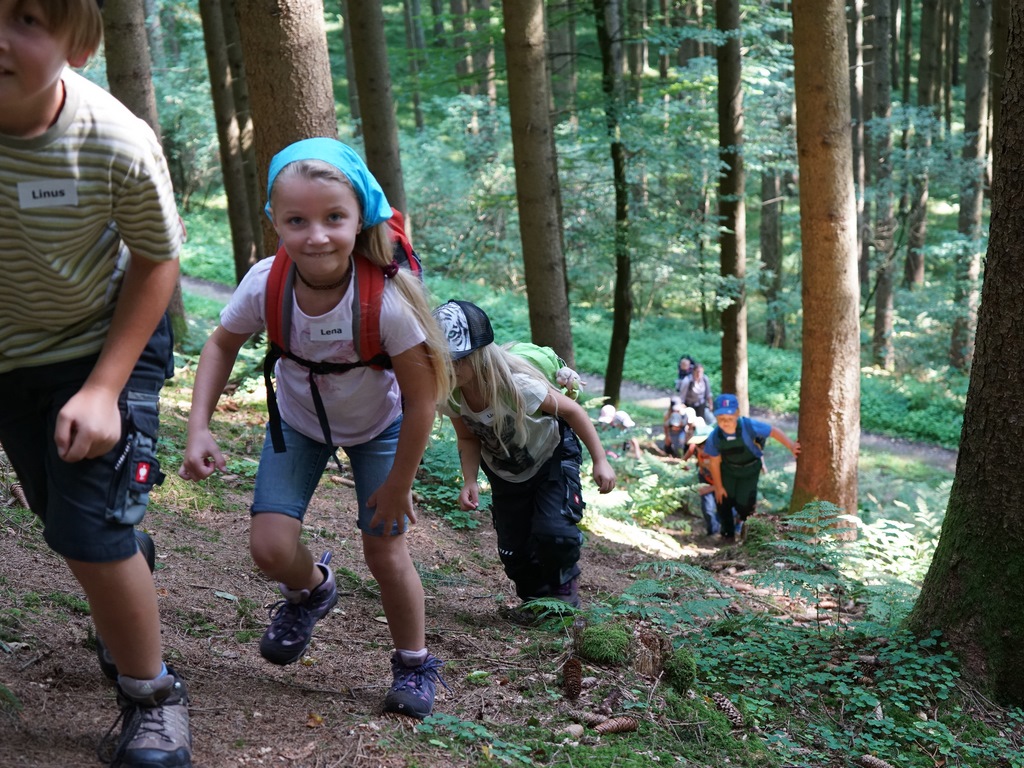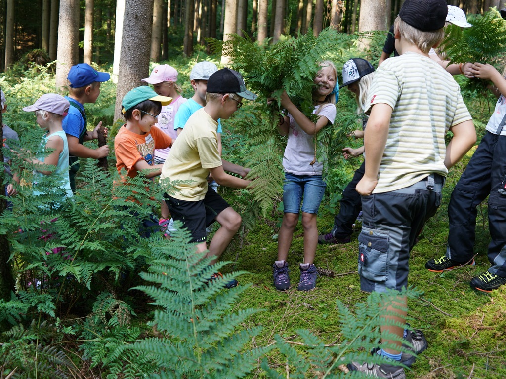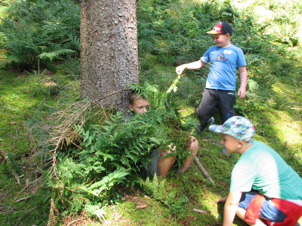 Beim Tarnspiel verschmolz nach dem Vorbild der Tiere und durch die tatkräftige Hilfe der gesamten Gruppe die passendes Material suchte und für die Tarnung verwendete, jeweils eines der Kinder mit seiner Umgebung. Weiter ging es: über einen Wildwechsel erklomm die Gruppe einen Berg, es wurde ausprobiert, wie schwer es Eichhörnchen und Eichelhäher haben wenn sie ihre versteckten Nüsse wieder suchen, ein Jägerpirschweg für Murmeln wurde angelegt und auf seine Tauglichkeit überprüft. Vorbei an einer Dachsburg ging es zum Wildacker, denn nicht nur Bauern, auch Jäger legen Äcker an - das wissen die Kinder jetzt.