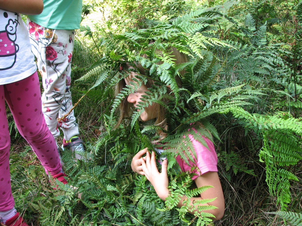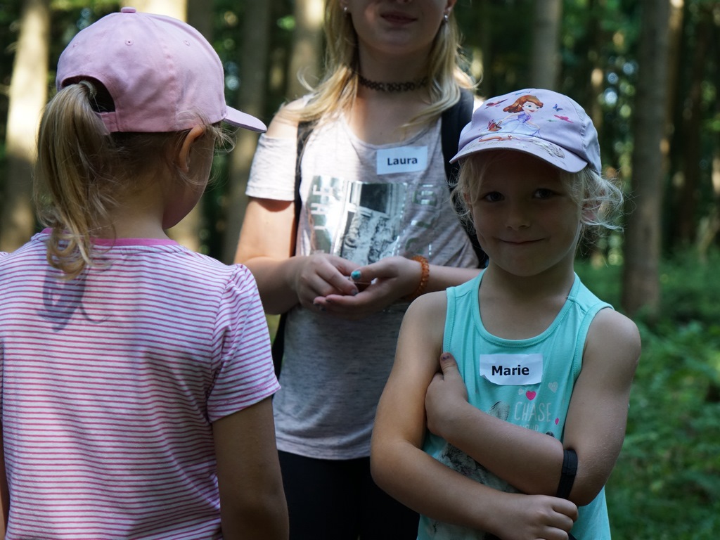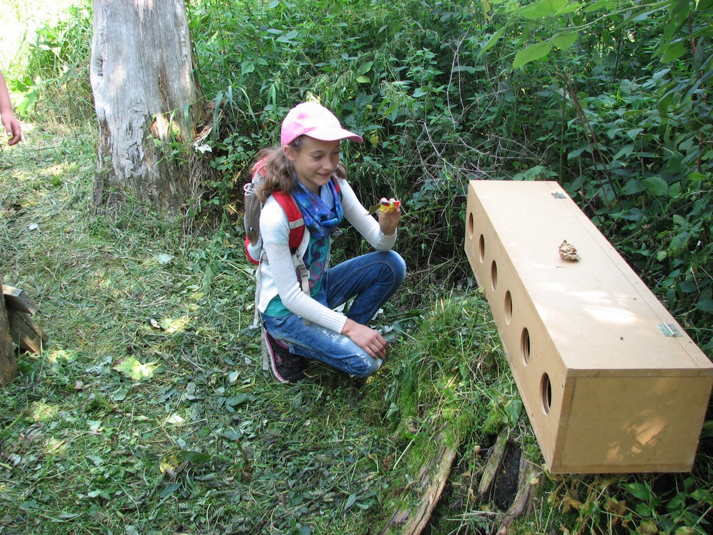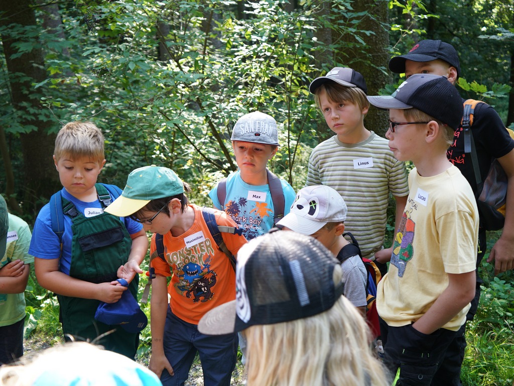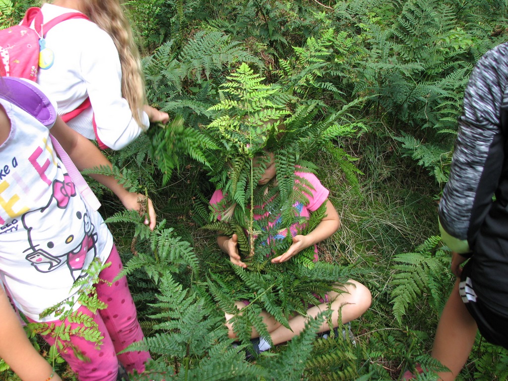 Beim Tarnspiel verschmolz nach dem Vorbild der Tiere und durch die tatkräftige Hilfe der gesamten Gruppe die passendes Material suchte und für die Tarnung verwendete, jeweils eines der Kinder mit seiner Umgebung. Weiter ging es: über einen Wildwechsel erklomm die Gruppe einen Berg, es wurde ausprobiert, wie schwer es Eichhörnchen und Eichelhäher haben wenn sie ihre versteckten Nüsse wieder suchen, ein Jägerpirschweg für Murmeln wurde angelegt und auf seine Tauglichkeit überprüft. Vorbei an einer Dachsburg ging es zum Wildacker, denn nicht nur Bauern, auch Jäger legen Äcker an - das wissen die Kinder jetzt.