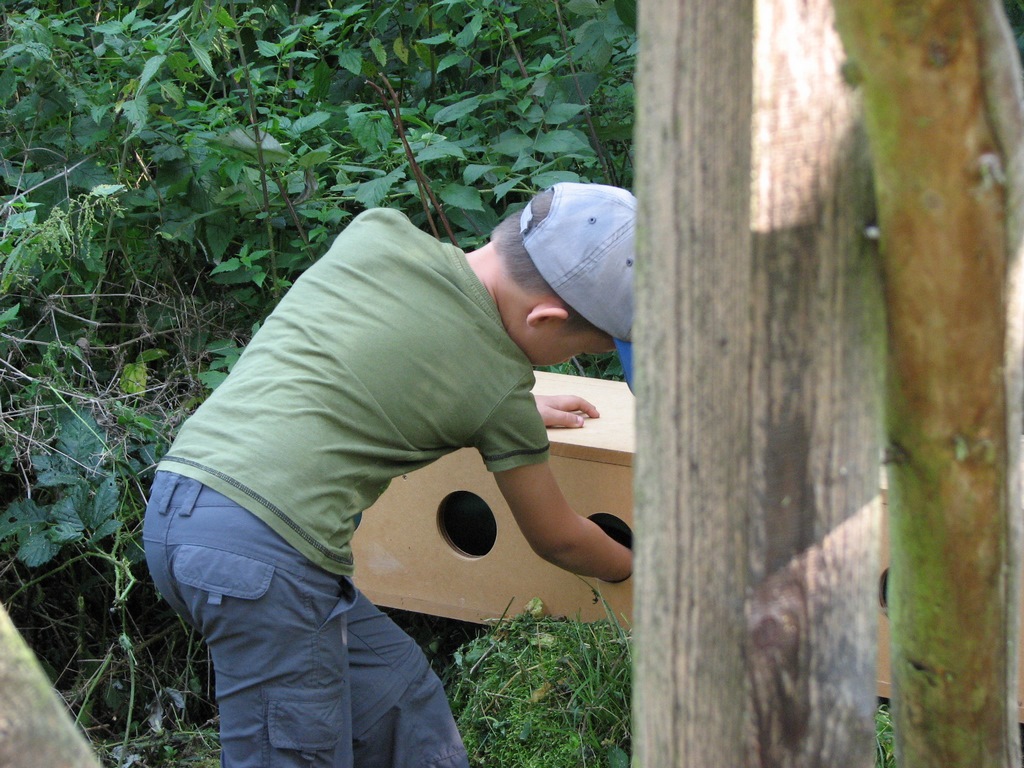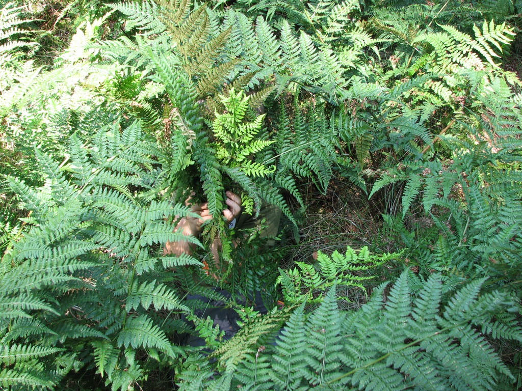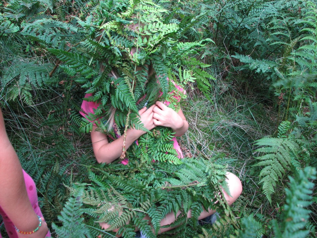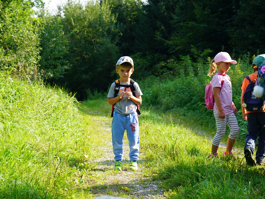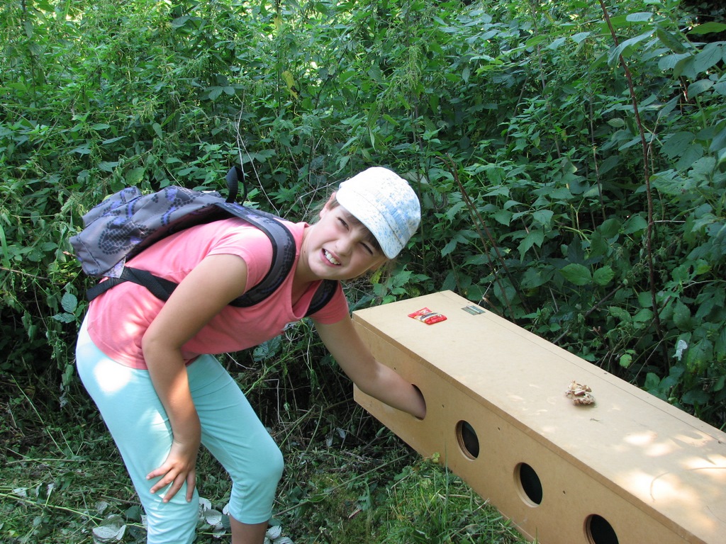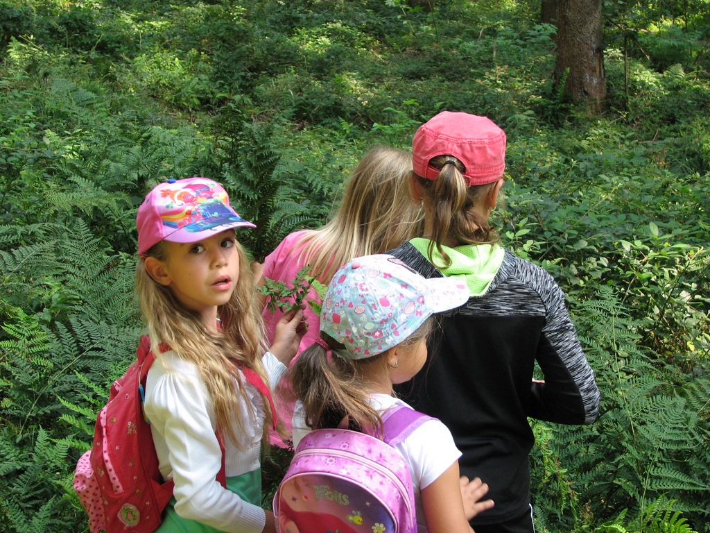Beim Tarnspiel verschmolz nach dem Vorbild der Tiere und durch die tatkräftige Hilfe der gesamten Gruppe die passendes Material suchte und für die Tarnung verwendete, jeweils eines der Kinder mit seiner Umgebung. Weiter ging es: über einen Wildwechsel erklomm die Gruppe einen Berg, es wurde ausprobiert, wie schwer es Eichhörnchen und Eichelhäher haben wenn sie ihre versteckten Nüsse wieder suchen, ein Jägerpirschweg für Murmeln wurde angelegt und auf seine Tauglichkeit überprüft. Vorbei an einer Dachsburg ging es zum Wildacker, denn nicht nur Bauern, auch Jäger legen Äcker an - das wissen die Kinder jetzt.