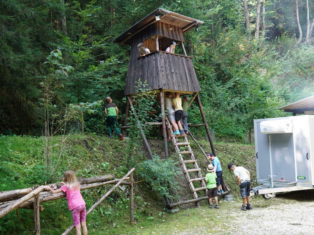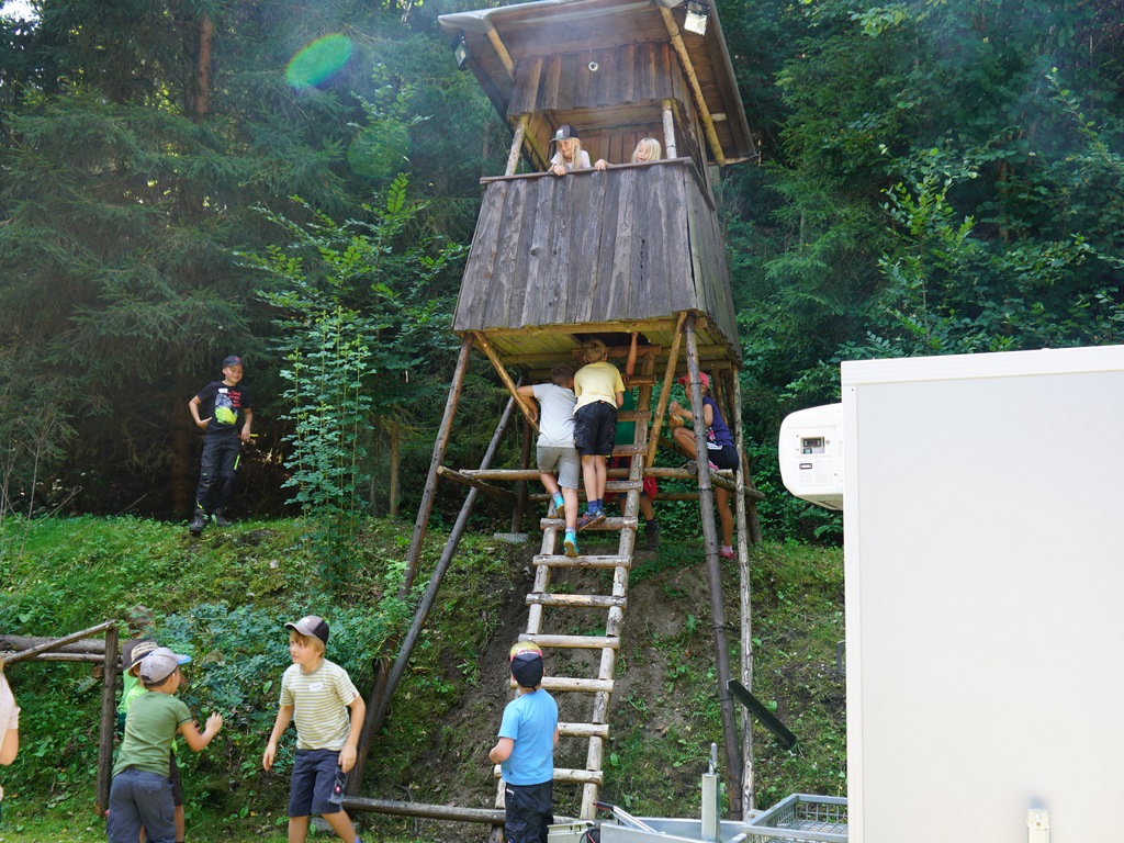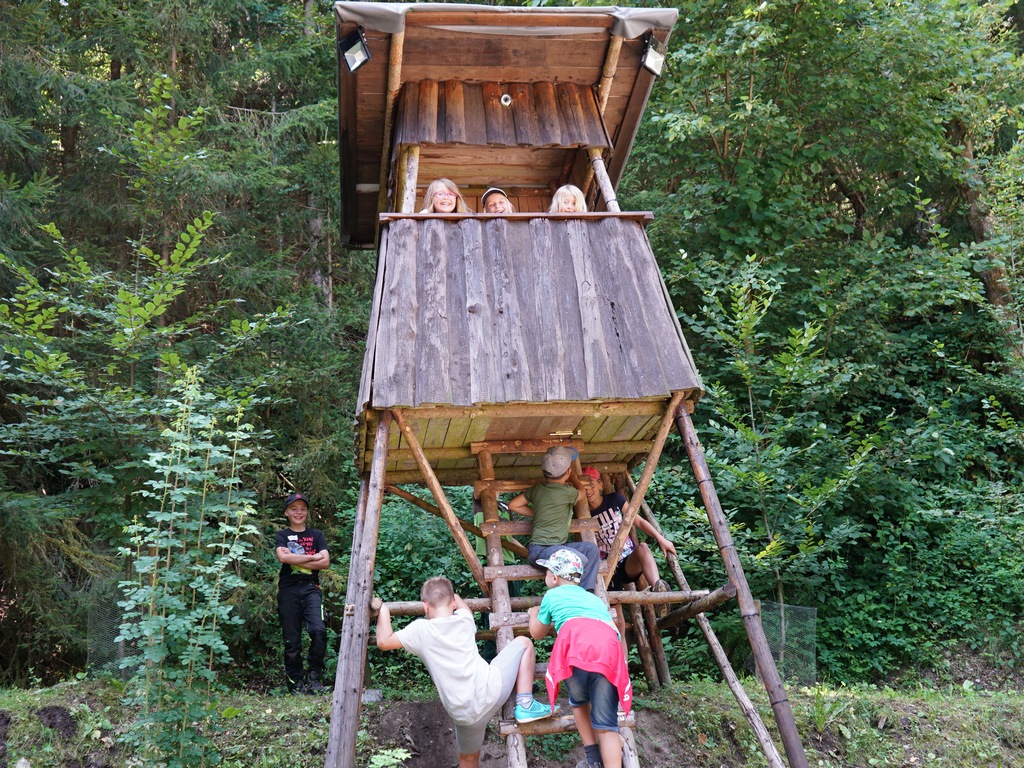 Nachdem die knapp 30 Kinder am Jagdbetriebsplatz eingetrudelt waren ging es mit Katharina und Matthias von NaturEvents Roscher schon los. In zwei Gruppen wurde an verschiedenen Stationen gespielt, erlebt und gelernt, was für einen Jäger und sein Revier von Bedeutung ist. So erklommen die Kinder einen Hochstand und suchten mit einem Fernglas, wie der Jäger, die Waldschneise ab. Zwei Jungen war dabei das Glück hold – ihnen sprangen tatsächlich zwei Rehe durch die Schneise.