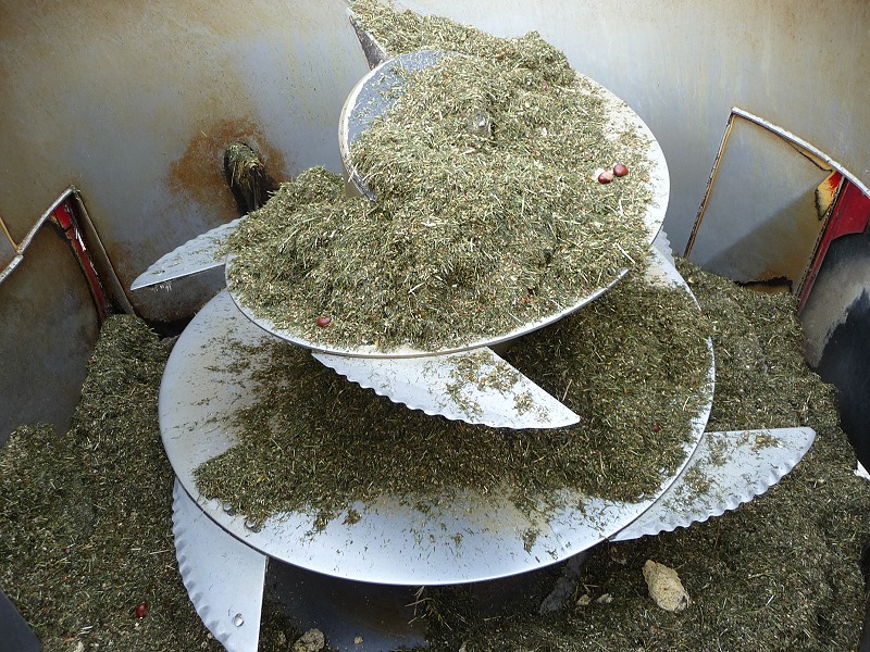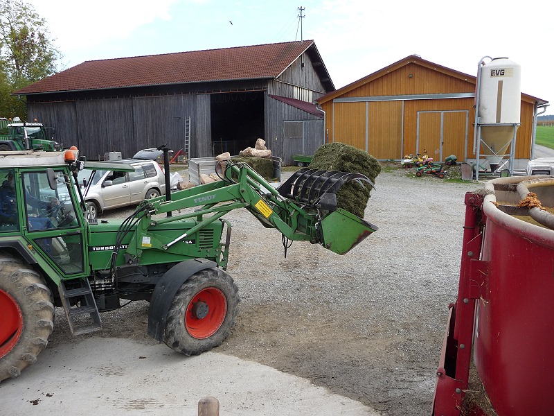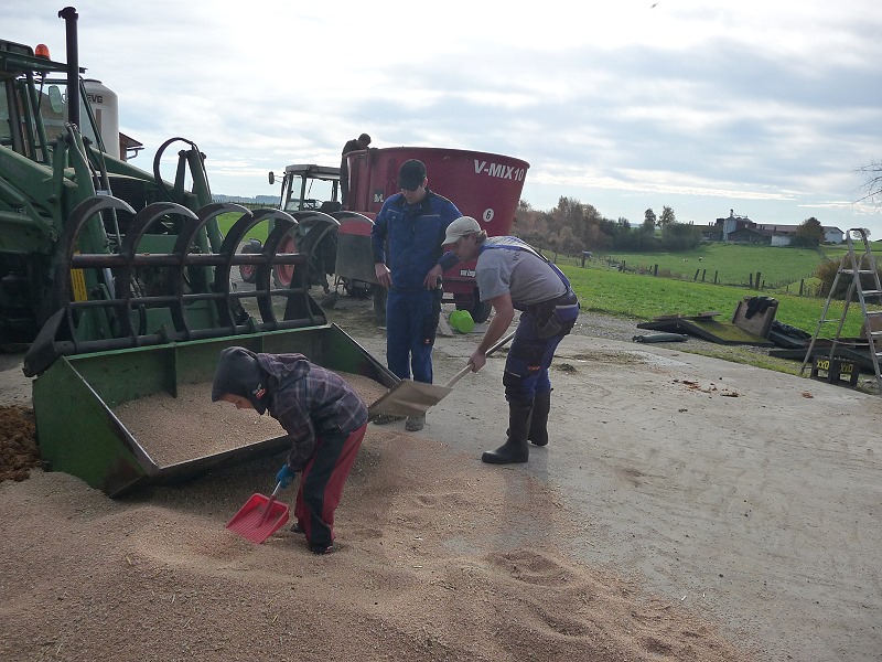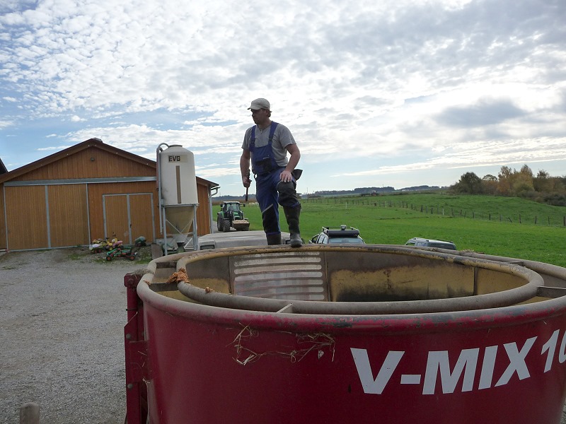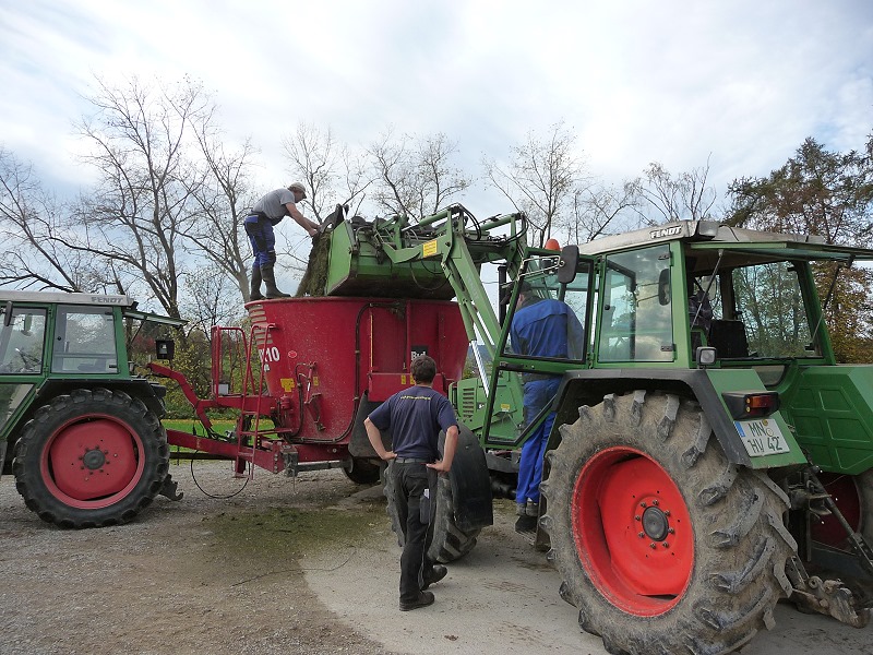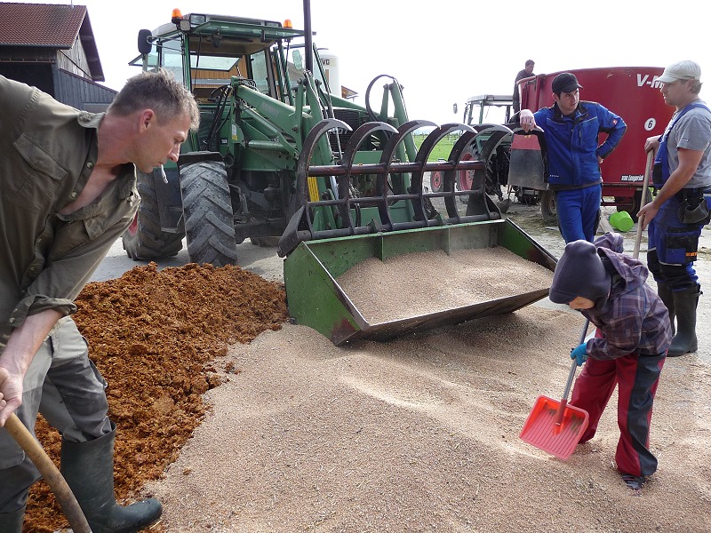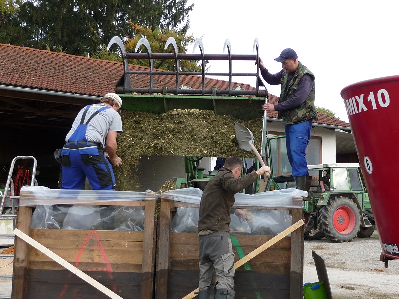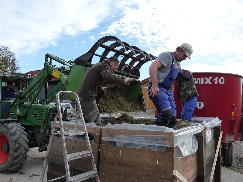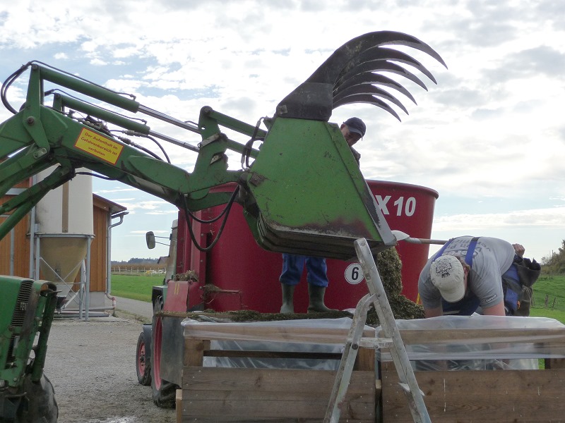 Bestehend aus: Grasscobsballen, Futterweizen, Zuckerrübenschnitzel getrocknet, Maiskornbruch und Maissilage und zu guter Letzt das zum silieren und zur Geschmacksabrundung nötige Apfeltrester!