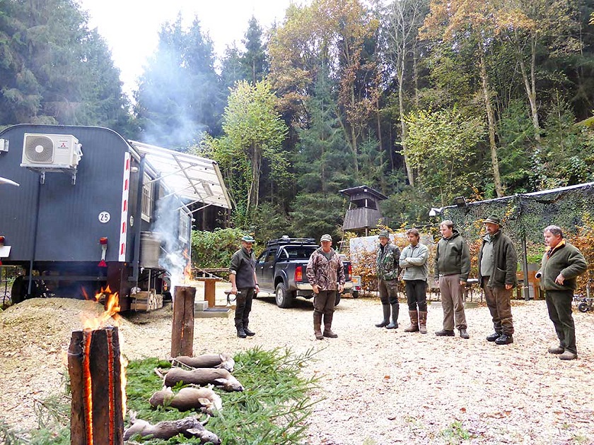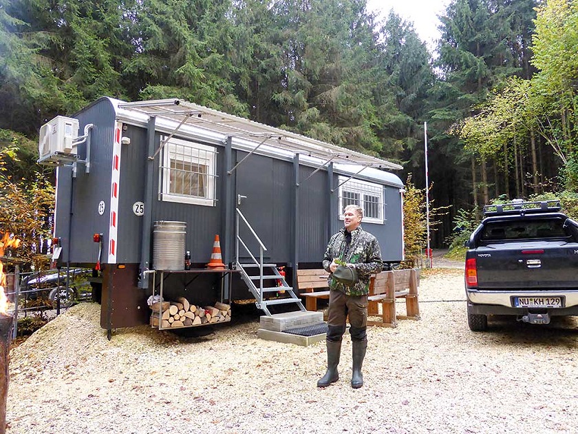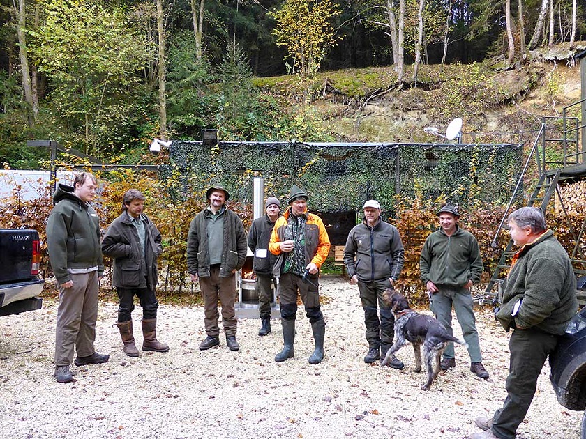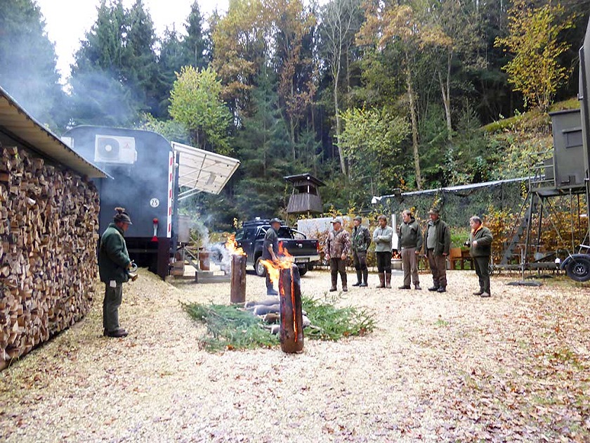 Befreundete Jäger und Reviernachbarn folgen meiner Einladung zum Abstellen unserer Reviergrenze, denn beim großen Nachbarn im angrenzenden Forstrevier ist Drückjagd angesagt. Die Kaffeemaschine im Jagdbetriebswagen schnurrt und spendet einen Kaffee nach dem andern für die um 9:00 Uhr eingelaufene Jägerschar auf dem Jagdbetriebsplatz in Kettershausen.