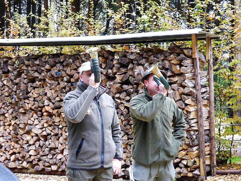 Nach meiner kurzen Ansprache, mit dem Versuch diese gestandenen Mannsbilder während der langen Ansitzzeit auch zum geistigen Innehalten zu motivieren, übergebe ich die Jagdleitung unserem professionell ausgebildeten Jäger Jens Classen. Nach der Bekanntgabe der Drückjagdregeln und einer eingehenden Sicherheitseinweisung wird von Jens und unserem Reviernachbarn Martin Seelos zum „Halali“ geblasen. Dieses stimmige Duett mit dem Jagdhorn ist mehr als gelungen und verbreitet bei mir sogleich eine jagdliche Leidenschaft hier und heute mein Bestes zu geben.