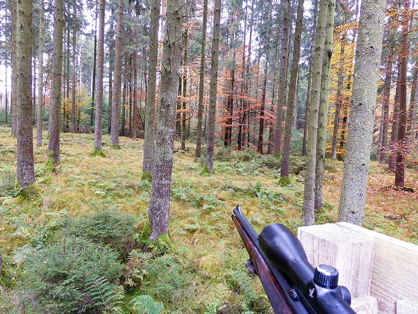 Kaum gesessen und die beiden Schokoriegel, die zu meiner Freude im Umschlag der mitgegebenen Drückjagdregeln und dem Anschussmeldebogen zu finden waren, zwischen meinen Zähnen zermahlt, meldet der erste Stöberhund, kommend vom Nachbarrevier, dass er „vielleicht“ einer warmen Wildfährte folgt. Gleich meinen Repetierer in Anschlag gebracht, denn das Gebell kommt auf mich zu, biegt dann aber doch in einen uneinsehbaren Fichtenanflug ab.
