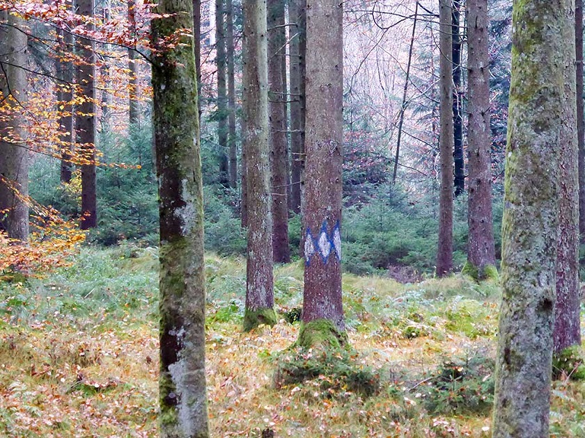 Minuten später ist auch der Stöberhund, wohl eine Dachsbracke, auf Sichtweite und beschnuppert das Kitz. Ein kurzer Pfiff von mir und er lässt ab, macht sich davon, zurück in Nachbars Dickungen. Das war’s dann wohl, irgendwann quert ein Reh mein Sichtfeld, aber leider hinter der Grenze beim Nachbarn. Die Grenze ist mit Baummarkierungen hervorragend gekennzeichnet.