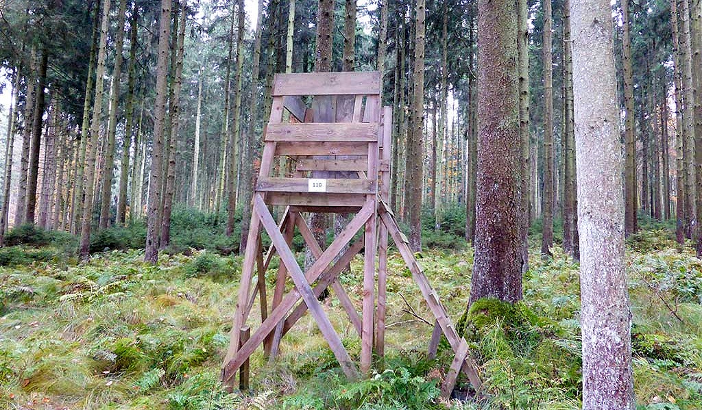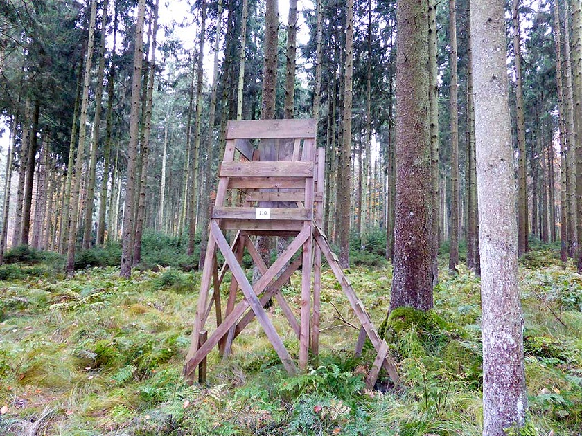 Ich schleiche voll beladen auf meinen Sitz 110 zu - ist das nicht auch eine Notrufnummer? Na denn! Schon sitze ich auf den Brettern und bereite mich mit mitgebrachten Decken und Wohlfühl-Equipment auf eine mehrstündige Ansitzzeit vor. Ach ja, das Laden meines R93 hätte ich beinahe übersehen und mit Ritsch/Ratsch verrate ich mich kurz nach halb zehn selbst in den kleinen Fichteneinständen um mich herum. |