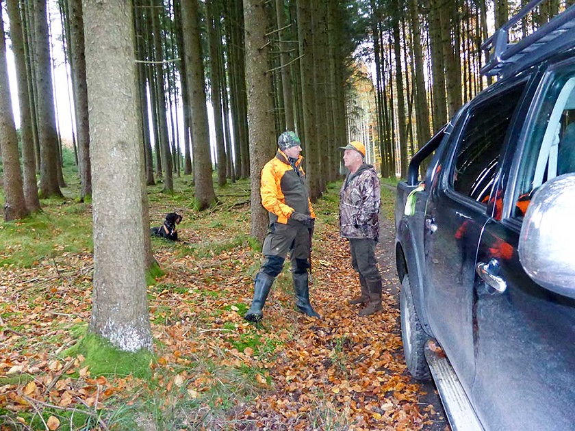 Aufgesessen - die Ansteller Jens und unser Revierjäger Peter Schlump übernehmen die Jägerschar. Die Drückjagdstände sind gut markiert und geben eine weite Übersicht im Bestand, vornehmlich hin zur Grenze unseres forstamtlichen Reviernachbarn.