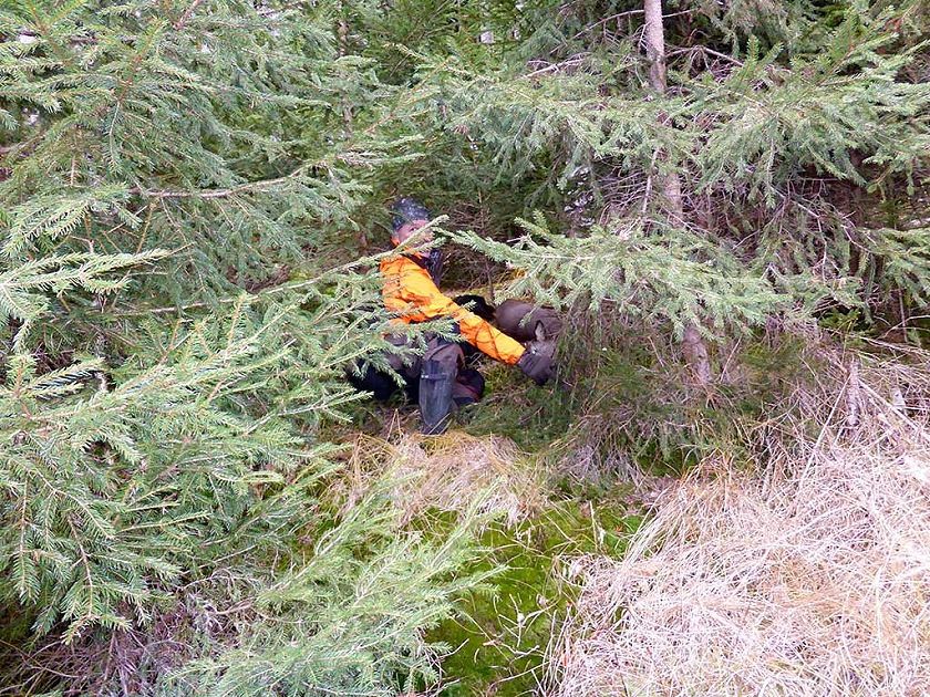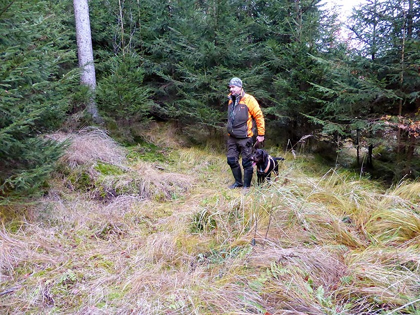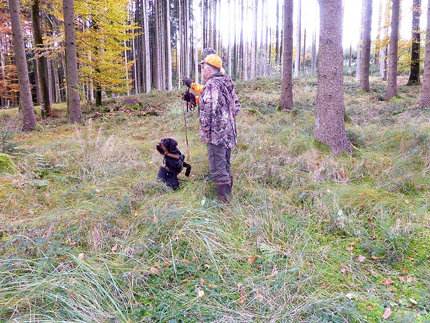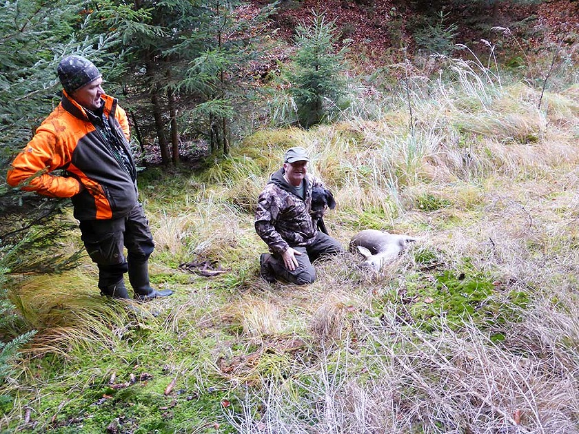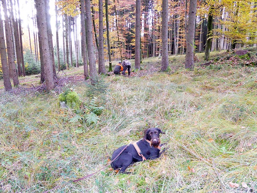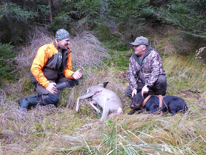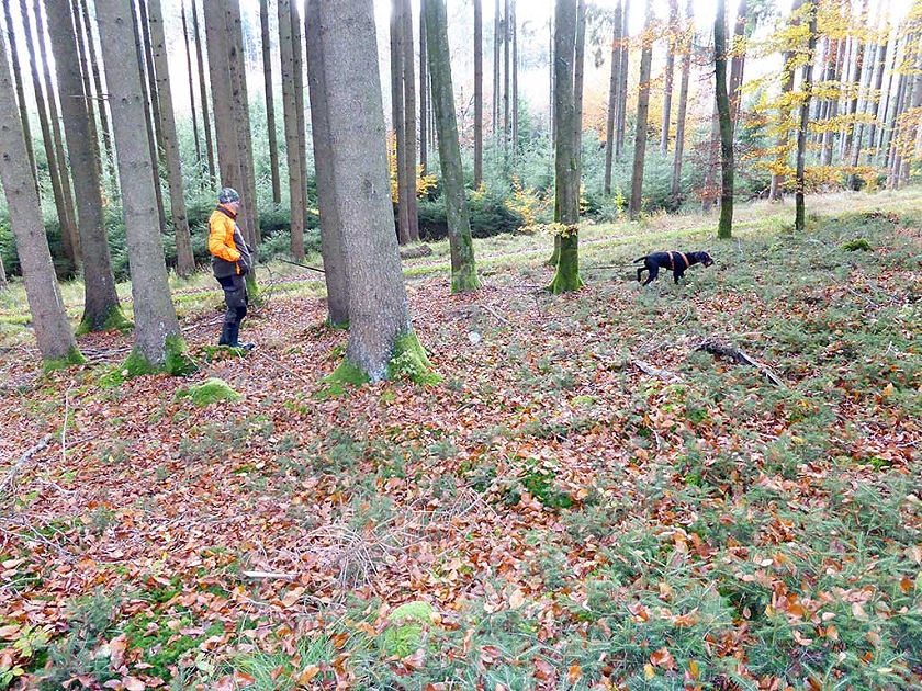 Peter, Benno und ich folgen Uwe zum vermeintlichen Anschuss des dritten erlegten Rehs. Schnitthaar und ein winziger Tropfen Schweiß zeugen von einem Treffer. Nicht ganz sicher, ob es Lungenschweiß ist (interpretiere jedenfalls ich den Fund), holt Uwe Benno und lässt ihn mit Ruhe und seiner üblichen Gelassenheit am Anschuss Witterung aufnehmen. Da Uwe der Züchter und Mitausbilder meines Bennos ist, schauen Peter und ich gerne zu, wie die Profis die Sache angehen. Peter hastet mit einer Kamera hinter uns her, um ein paar Momente dieser Nachsuche einzufangen. Hinunter, in eine Dickung zieht dann Benno mit Uwe, und ich kann kaum folgen. Oh, mein Gott, da unten an dem Graben ist die Reviergrenze, durchfährt es mich, als Benno ein paar Meter darüber hinwegfegt. Aber er kommt zurück. Uwe setzt ihn weiter zurück erneut an. Keinen abgestreiften Schweiß habe ich bisher gefunden, aber es geht auch viel zu schnell. Als ich plötzlich die lauten Lobeshymnen von Uwe zu vernehmen gedenke, weiß ich, Benno und Uwe waren erfolgreich. Nur Minuten nach dem Ansetzen auf die Schweißspur hat Benno das erlegte Stück etwa 70 Meter vom Anschuss inmitten einer Dickung gefunden. Mit einem guten Treffer aufs Blatt - und trotzdem noch diese weite Fluchtstrecke, erstaunlich. Ich bin happy, freue mich über dieses Lehrstück eines erfahrenen Meisters. |