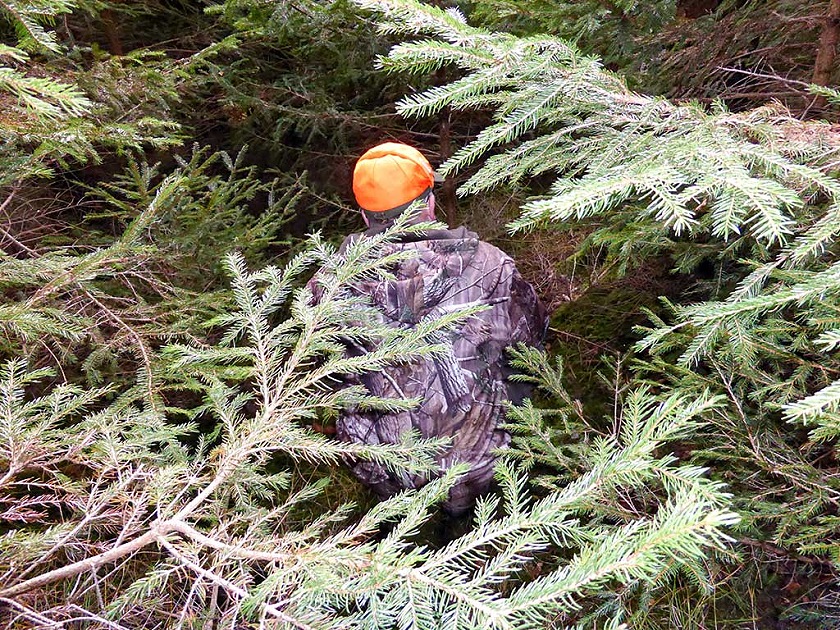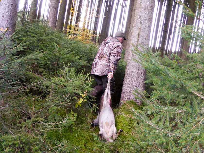 Da ist wieder ein lautstarkes Gebell unterwegs herunter zu mir vom nachbarschaftlichen Forsteinstand. Kein Wild ist zu sehen. Kurzes Warten – dann aber doch; etwa 70 Meter vor dem großen Fichtenanflug sehe ich etwas mit langen Ohren, halb verdeckt von Büschen. Ein Hase? Nein, beim genaueren Hinsehen ein schwaches Kitz, das hinter einer Buchenverjüngung mit proportional viel zu langen, stehenden Ohren herüberäugt. Angebackt und ein schneller, hoffentlich wildbret-schonender Schuss lassen das Kitz im Feuer zusammenbrechen.