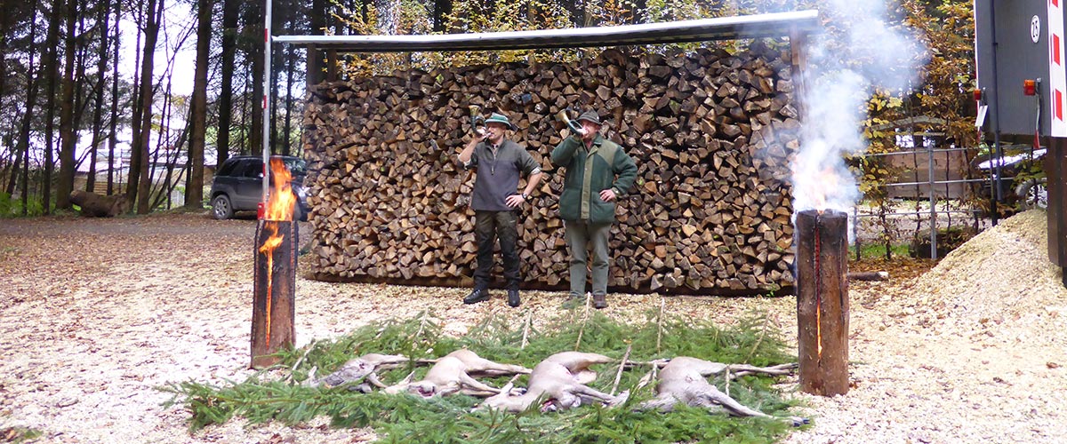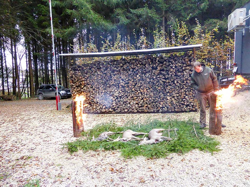 Zurück am Jagdbetriebsplatz haben die drei Rehe bereits auf dem mit Fichtenzweigen ausgelegten Streckenplatz ihre letzte Ruhe gefunden. Zwei brennende Schwedenfackeln flankieren das jagdlich stimmungsvolle Bild, das jetzt mit dem vierten Reh nochmals erweitert wird.