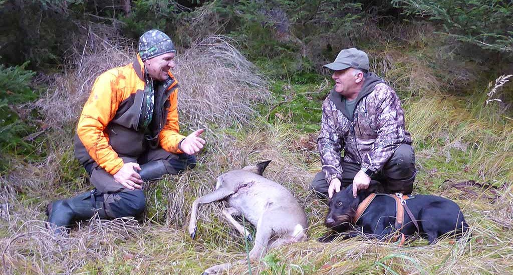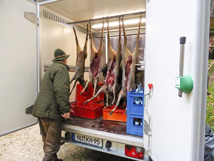 Als sie eintreffen, überrascht uns Uwe. Er hat drei Rehe erlegen können und ein Reh sollte per Todsuche von meinem Deutsch Drahthaar Jagdhund Benno nachgesucht werden. Innerlich hoch erfreut (es sollte die erste Nachsuche meines Bennos werden seit seiner kürzlich bestandenen Brauchbarkeitsprüfung), treten mein Hund Benno, Jens, Peter, Uwe und ich die Fahrt zum Abtransport der erlegten Rehe an. Jens bringt die beiden bereits aufgebrochenen Rehe gleich auf den Jagdbetriebsplatz zum weiteren Versorgen.