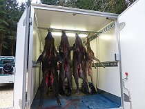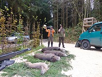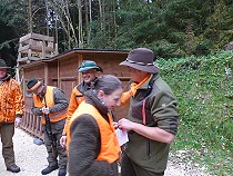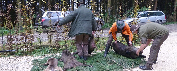 Professionell aufgebrochen, mit dem letzten Bissen in den Äser geehrt, wird nun die Strecke mit "Sau tot", "Reh tot" verblasen. Anschließend werden die Schützen traditionell mit den Erleger- Bruchzeichen vom Jagdleiter geschmückt und die erlegten Stücke in den Kühlwagen gehängt. |