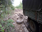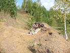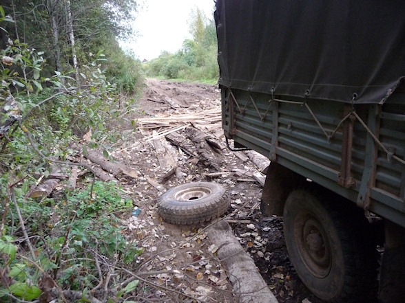 | Der Fahrer heißt Alexander und fährt nun so dicht wie möglich an den geschossenen Braunbären heran, um ihn aufzuladen. Aber wie bringt man ein so schweres Tier auf die Ladefläche? Ich schlage mit einer Axt drei gleich große etwa vier Meter lange Birken um, nehme zwei der Stämme und baue eine Rampe zur Ladefläche. Mit dem dritten versuche ich den Bär hinauf zu hebeln, es gelingt erst, als Alexander mit einer Kette die Vorder- und Hinterläufe festgemacht hat und von oben - über einen Haken am Führerhaus – das Tier gegen das Zurückrutschen absichert hat. |