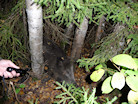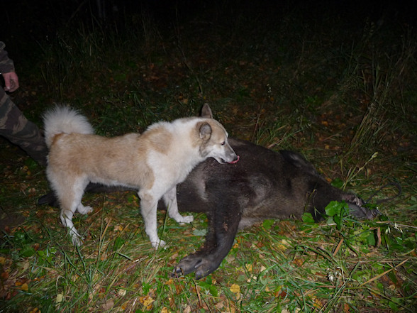 Alexander und der zweite Jäger helfen mit, meine gefundene hellrote Schweißspur zu verfolgen und als wir am Waldrand stehen, holen wir einen Huskie, der zwei Schritte dahinter ein dunkles graues Etwas anbellt: Objekt gefunden. Der Schuss sitzt gut und war absolut tödlich, aber man weiß ja nie. Der Keiler hat sich gleich hinter der Waldgrenze zwischen mehreren eng stehenden Bäumen so verkeilt, dass wir ihn herauswinden müssen. |