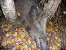 | Ein paar Zentimeter zu hoch hat ihn der Durchschuss unter der Wirbelsäule am Leben gelassen, aber bewegen konnte er sich nicht mehr. Etwa 130 Meter oder mehr ist der Drückjagdsitz entfernt. Nach den üblichen Glückwünschen für den Jagderfolg laden wir den Keiler auf den Lkw und treten den Heimweg an |