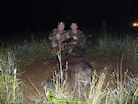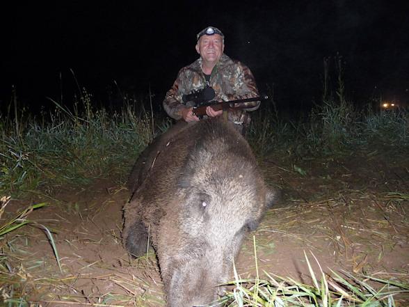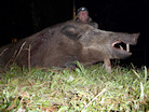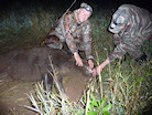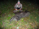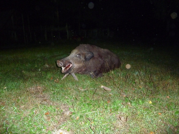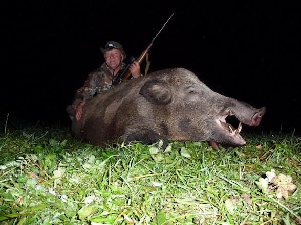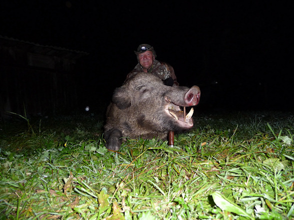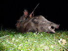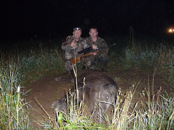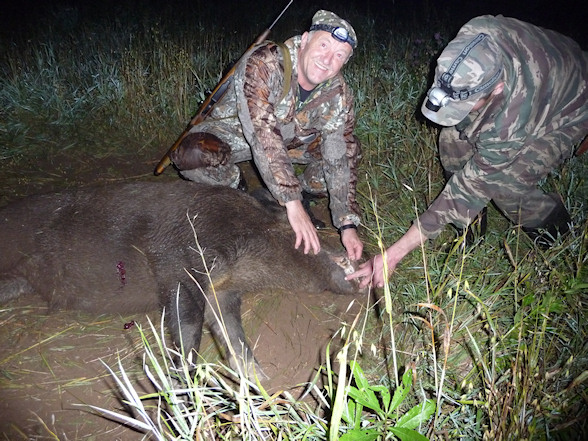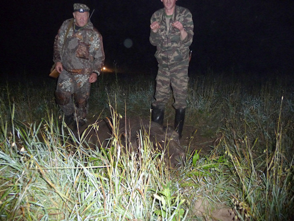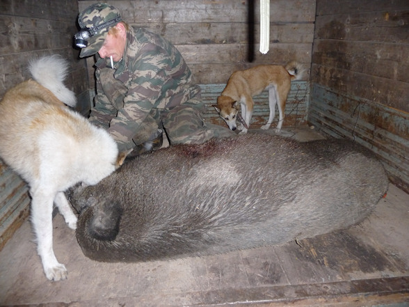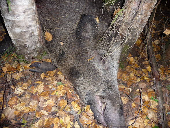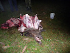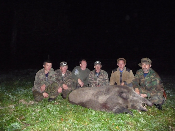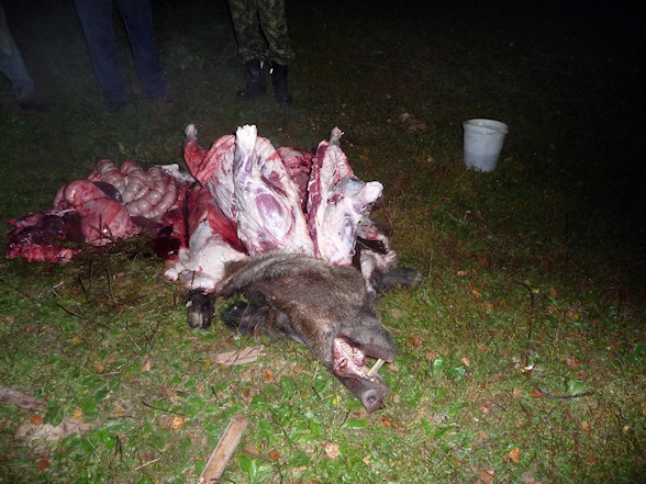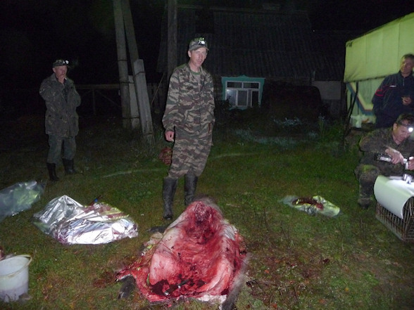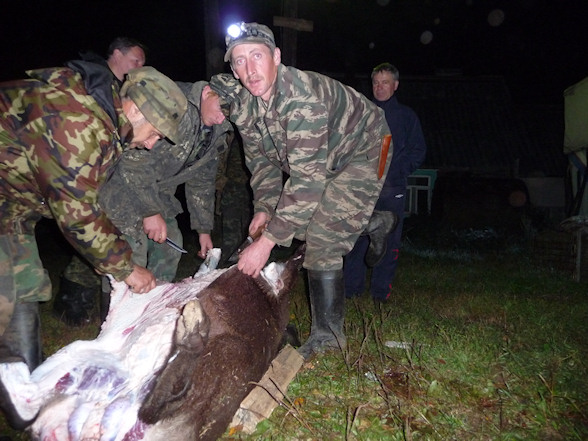| Großer Jubel bei meinen russischen Freunden. Auch der hiesige Jagdchef gratuliert und meint anerkennend, es sei der größte Keiler der Saison, etwa 150 Kilogramm schwer. Wodka und ein paar essbare Kleinigkeiten verteilt Sergey 1 in die Runde, die sich sogleich aufmacht, den Keiler aufzubrechen und an Ort und Stelle zu zerlegen. In einer unglaublich schnellen Viertelstunde oder höchstens 20 Minuten, liegt dann auch nur mehr die Schwarte auf der Wiese. Der geschossene Keiler ist Geschichte und gegen 2 Uhr morgens kommen wir endlich alle ins Bett. Ein langer Jagdtag geht zu Ende. |