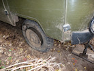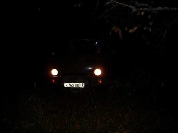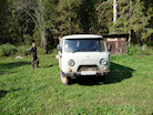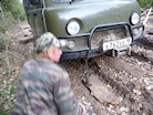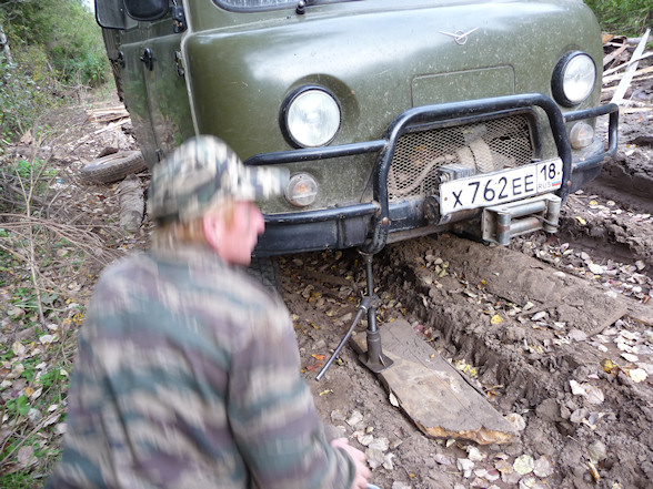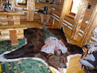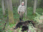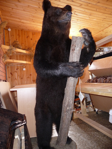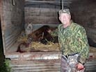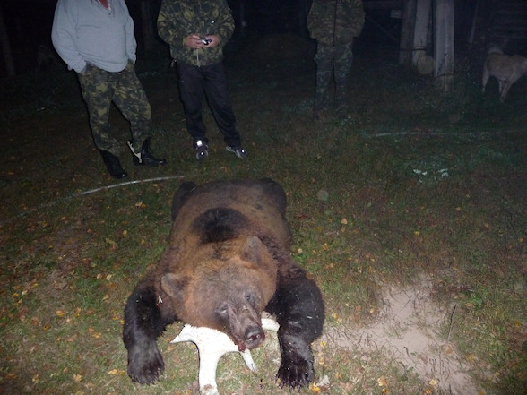 Der Bär mit einem Gewicht von weit über 200 Kilogramm liegt oben, meine Klamotten sind einschließlich der Jacke durchgeschwitzt. Jetzt soll's zügig heimgehen. Prompt versacken wir mit dem Uaz in einem schlammigen Wegstück. Das Zusatzgewicht hat ihn bis zu den Achsen tief eingraben lassen. Nachdem wir die eingebaute Seilwinde vom Schlamm befreit haben können wir uns selbst aus dem Schlamassel ziehen. Gegen 2.00 Uhr kommen wir zu Hause an. Alle werden geweckt und die gleiche Prozedur wie beim Keiler beginnt von Neuem. So ist halt die russische Tradition. |