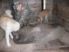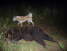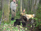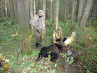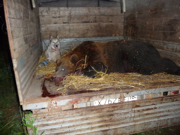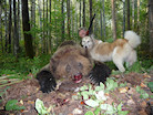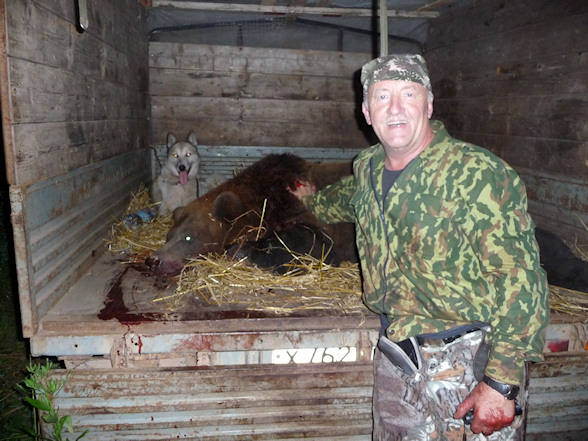 | Wladimir gratuliert mir zu diesem Schuss. Ich sehe, es ist eine Bärin, die es da erwischt hat, etwa drei bis vier Jahre alt und vielleicht 130 Kilo schwer, meint Wladimir. Sergey 1 kommt dazu, die Hunde werden gelobt und das gewohnte Prozedere beginnt von Neuem. |