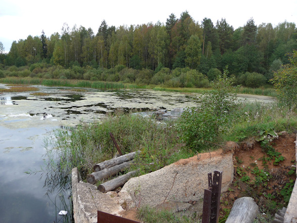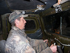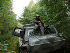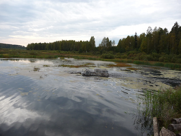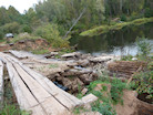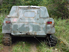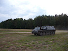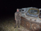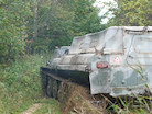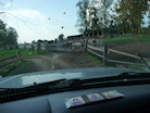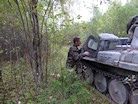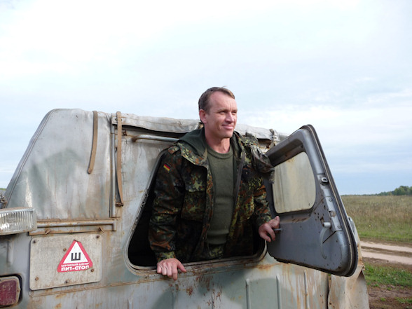 | Wir toben mit dem Panzer über Jungholzflächen, drei bis vier Meter hoher Baumbestand knickt weg wie nichts und jedes Mal, wenn ein größerer Baum auf uns zu kommt, ducke ich mich weg, aus Angst, dass ich nun gleich persönlich Kontakt mit dem Stamm bekomme. Aber die dicke Blechkiste verträgt so Einiges und weiter geht’s. Dann stehen wir vor einer notdürftigen Brücke. Drüber fahren scheint Sergey 2 zu gefährlich zu sein, also muss er durchs Wasser. Es ist ja ein Schwimmpanzer. |