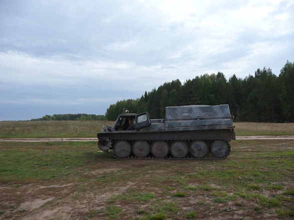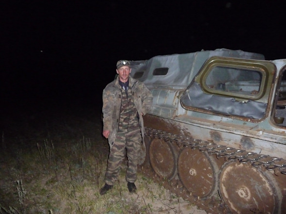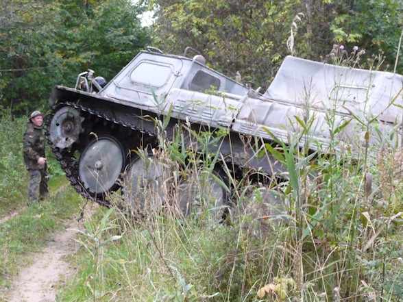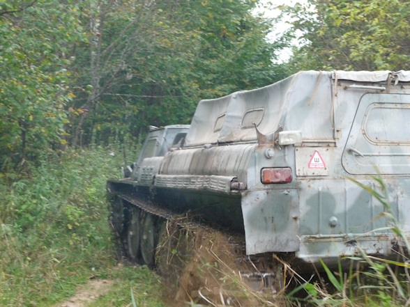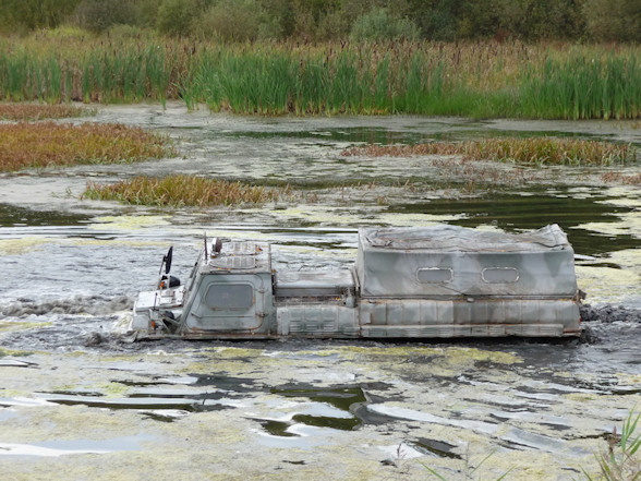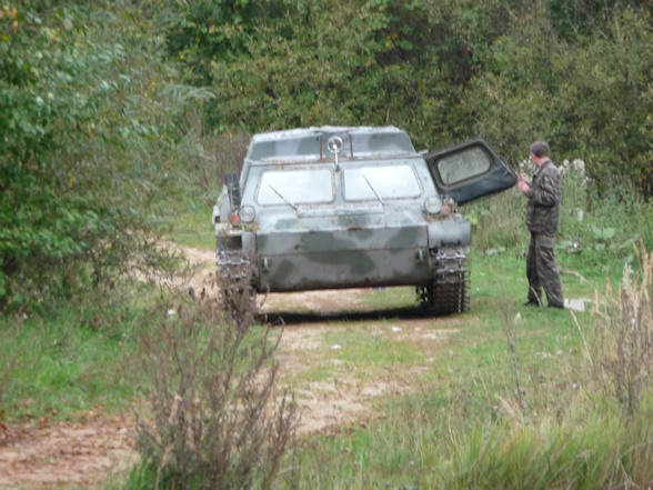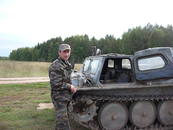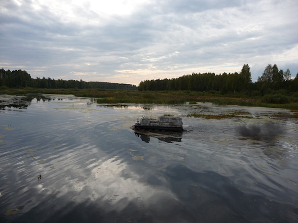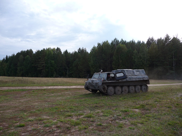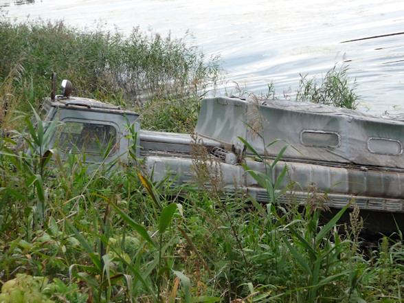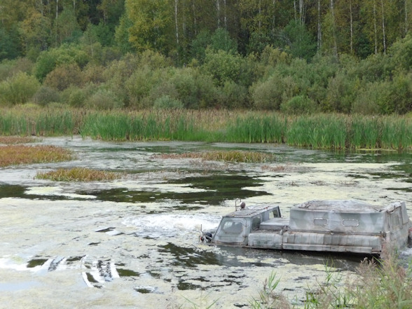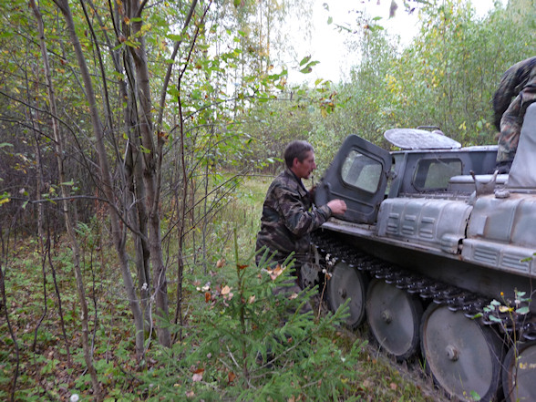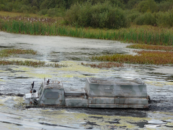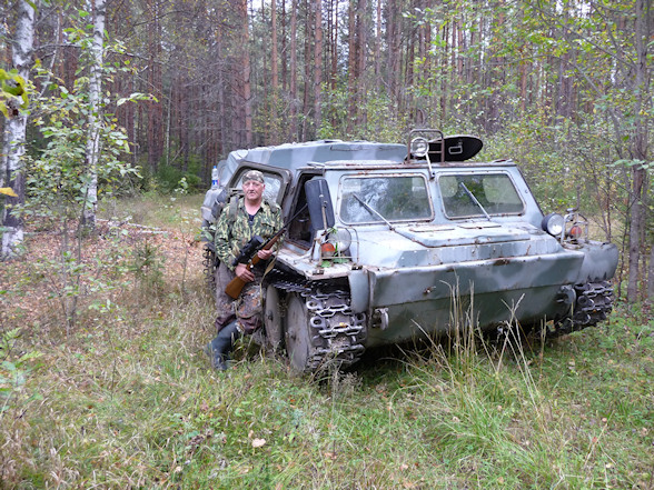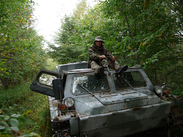 Wladimir, der Jagdhofchef, gönnt Sergey 1 und mir noch einen Jagd-Spezialausflug. Es gibt Gegenden, wo man nicht, und auch nicht mit geländegängigen Fahrzeugen, in seinem Revier hinfahren kann, ausgenommen mit einem schwimmenden Geologenpanzer. Das soll noch einmal ein Highlight unseres Aufenthalts werden, am letzten Tag vor unserer Abreise. Am frühen Nachmittag steht statt dem Uaz Gelände-Lkw der Schwimm-Panzer des Jagdreviers vor unserer Hütte und Sergey 2, der Fahrer, winkt uns heran. Sergey 1 und ich packen unsere Ausrüstung hinein und ich nehme vorne, Sergey 1 hinten unsere Plätze ein. Los geht’s. |
