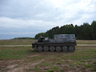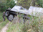 | Aber beim Hinauffahren auf die Uferböschung macht er den Fehler und fährt zu schräg an. Als er oben ist, sehe ich, dass die rechte Kette aus den Führungsrollen gezogen wird. |