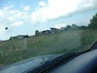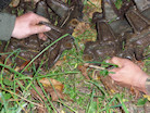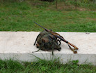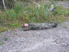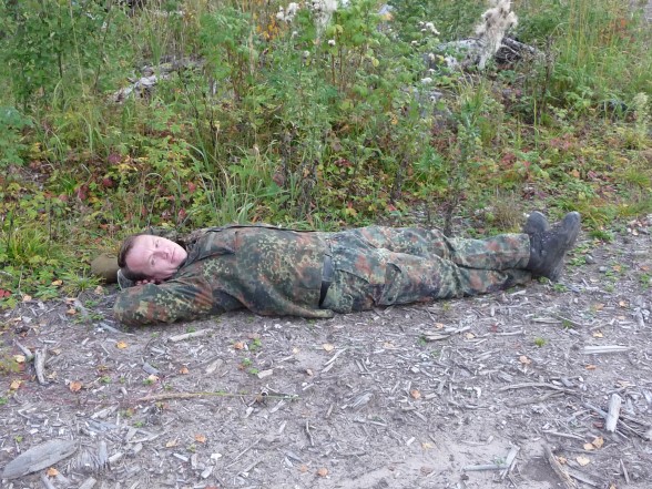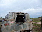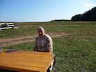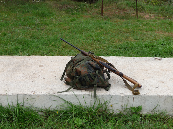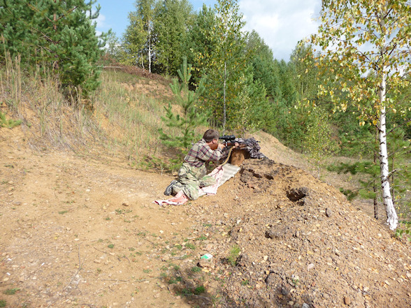 | Mittags gibt es jede Menge gekochtes Keilerfleisch. Danach fahren Sergey 1 und ich mit zu Schießübungen, in eine stillgelegte Kies-, nein, eher in eine verlassene Sandgrube und schauen zu, wie der russische Experte ein Nachtvisier einschießt. Auch wir dürfen ein bisschen rumballern. Das alles in der stechenden Mittagshitze. |
