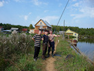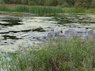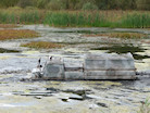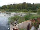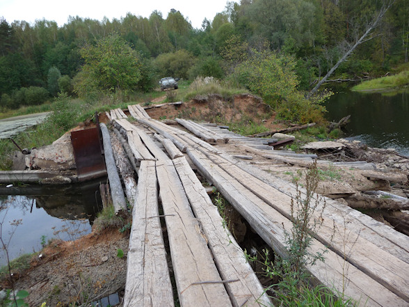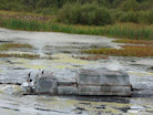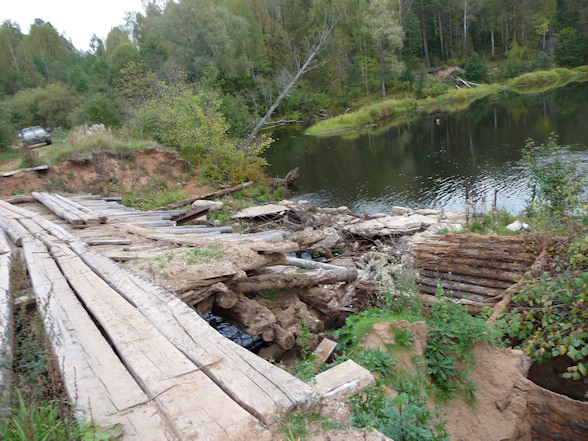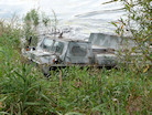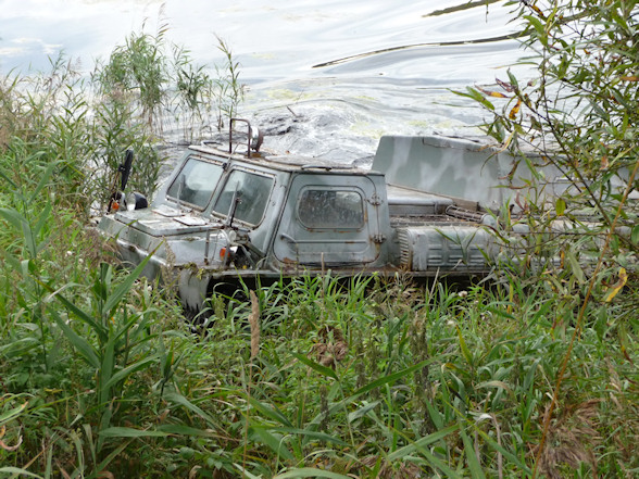 | Sergey 1 und ich steigen aus und schauen uns das Spektakel lieber vom sicheren Ufer aus an. Alles kein Problem. Souverän lenkt und schwimmt Sergey 2 mit seiner Kiste ans andere Ufer. |