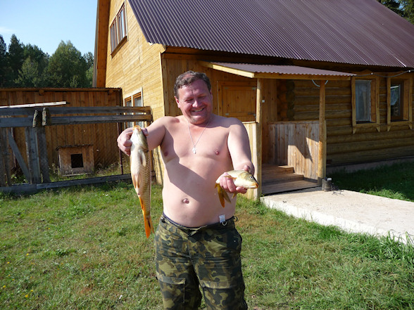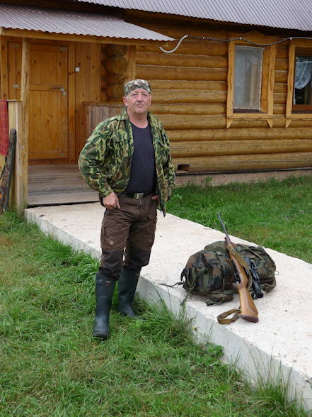 | Dann kommt er, der Jagdhofchef Wladimir Rijabov. Sein feststehendes Jagdmesser lässig an den Gürtel geschnallt. Instinktiv vergleiche ich ihn sofort mit meinem deutschen Revierchef. Noch wage ich keine Aussage, sehe aber jetzt schon, dass sein grimmiger Blick keine Widersprüche zulässt und lasse unseren deutschen Sergey mit seiner diplomatischen Art die ersten zarten Bande knüpfen. |