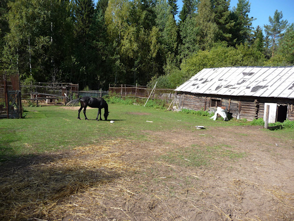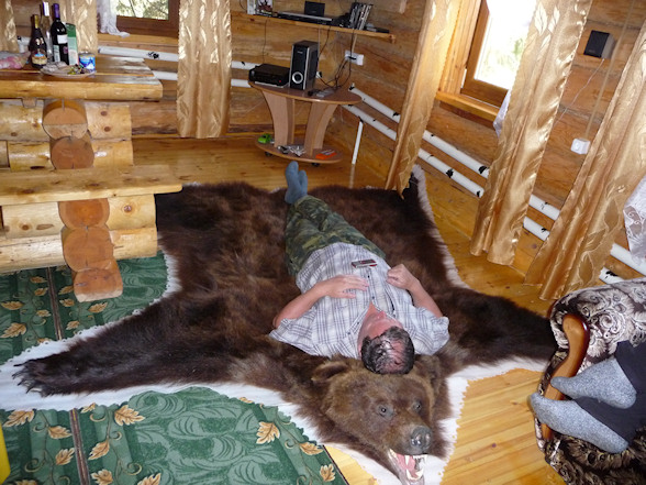 Nach dem Erfolg gilt es erst einmal auszuschlafen. Doch das ist weit gefehlt, denn Wladimir hat eine Hundetreibjagd organisiert und mich als Jäger eingeplant. Zehn Lizenzen für den Braunbärenabschuss hat er vom russischen Staat gekauft. Die muss er jetzt natürlich weitergeben. Das ökologische und ökonomische Gleichgewicht des Jagdhofes und seiner Umgebung ist mir noch nicht ganz klar. Ich sehe viele Einwohner des Dorfes, die offenbar im Jagdbetrieb und an der Hundezucht beschäftigt sind. Es gibt sonst nur ein kleines Krankenhaus und eine staatlich organisierte Milchwirtschafts-Kolchose. |