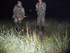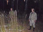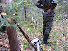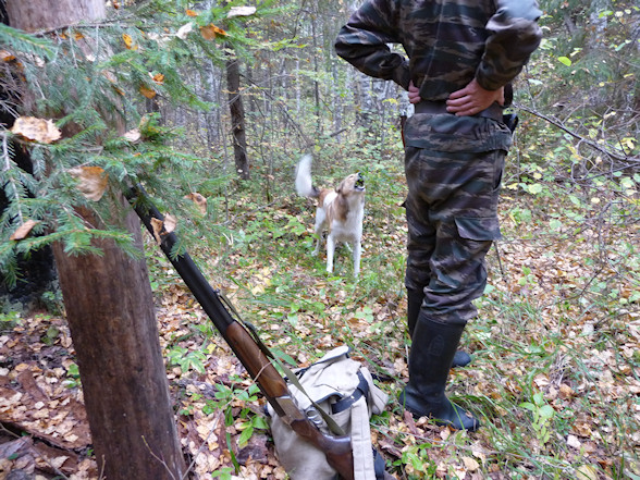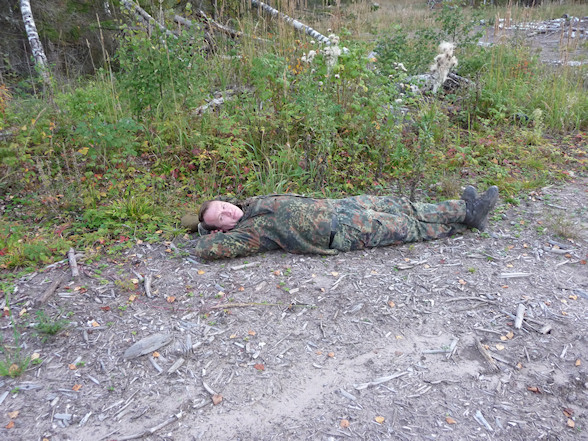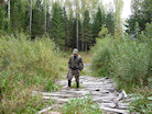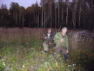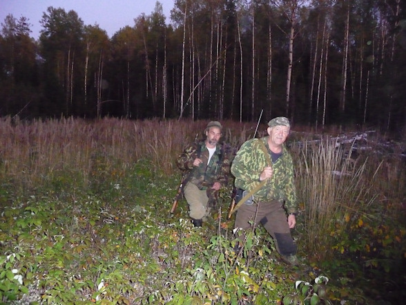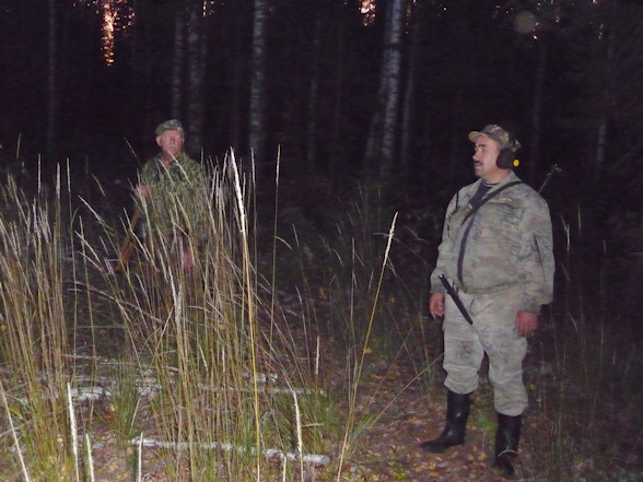 | Wladimir, Sergey 1 und ich bilden wieder ein Jagdteam. Wenn einer der Kundschafter was hört oder vielleicht auch nur vermutet, was gehört zu haben, ruft er per Funk Wladimir und schon pirschen wir zu dritt los. Wladimir mimt den Brunftschrei eines Elchs nach! Ein kurzes heiseres oouuaaacchhhh! Und immer wieder oouuaacchhhh! |