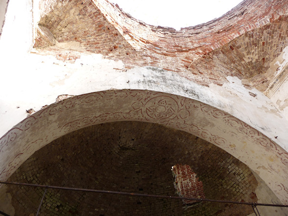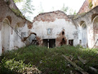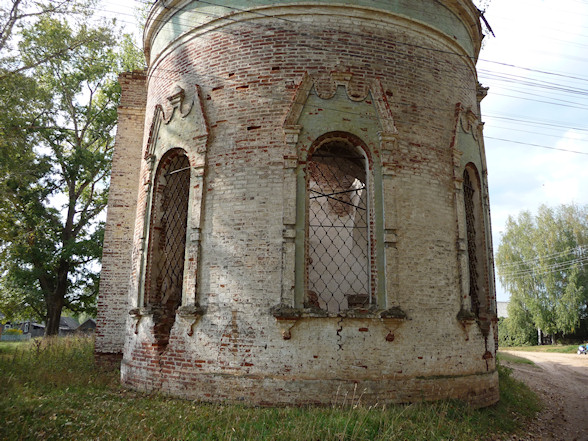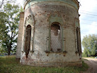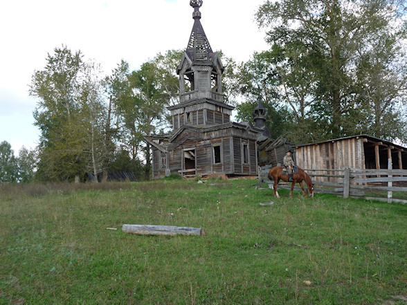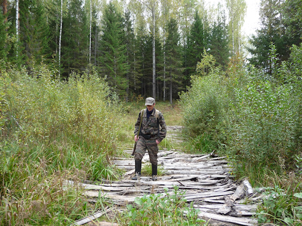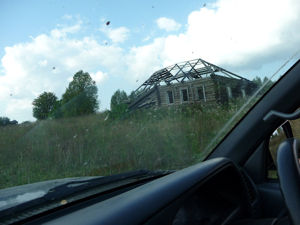 Er ist ein russischer Berufsjäger, durchtrainiert und wiegt vielleicht 60 Kilogramm. Er gibt mir eine Waffe, auf den ersten Blick ein Büchsenrepetierer. Mehr kann ich ohne Brille sowieso nicht erkennen. Wir steigen ein in die russische Kiste. Es ist etwa 16.00 Uhr, los geht’s. Wir fahren raus auf die Landstraße, hinein in ein Dorf mit dem Namen Kopki und verlassen dieses wieder hinter einer auffällig zusammengefallenen Kirche, die eine wunderschöne Baukonstruktion aufweist, aber leider seit Jahrzehnten dem Verfall preisgegeben ist. |