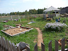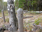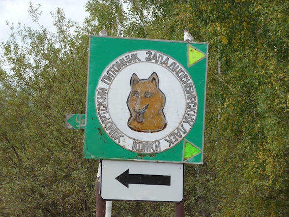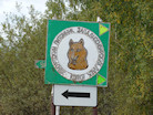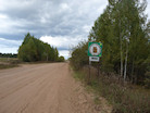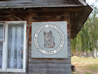 | Ja, wir sind da, ein symbolisches Hinweisschild mit einem Bär drauf zeigt uns die letzte Abbiegung zum Jagdhof mit der Jagdhütte, die jetzt zwei Wochen lang unsere russische Heimat werden soll. |