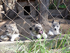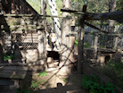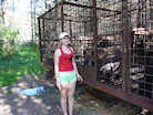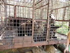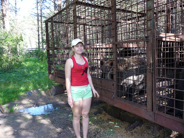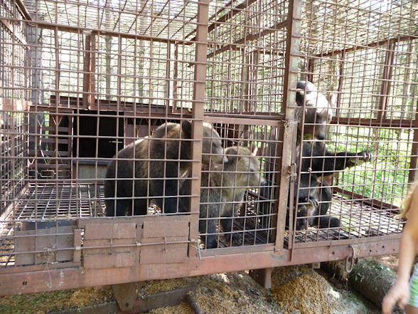 | Ein Bärengehege zeigt eindrucksvoll, welche Größe die Bären erreichen können; weit über 2,5 Meter ist ein männlicher Insasse groß und brummt uns an, als wir das mitgebrachte Brot an zwei kleinen Nachwuchsbären verfüttern wollen. Gehalten werden die hier für Ausbildungszwecke. |