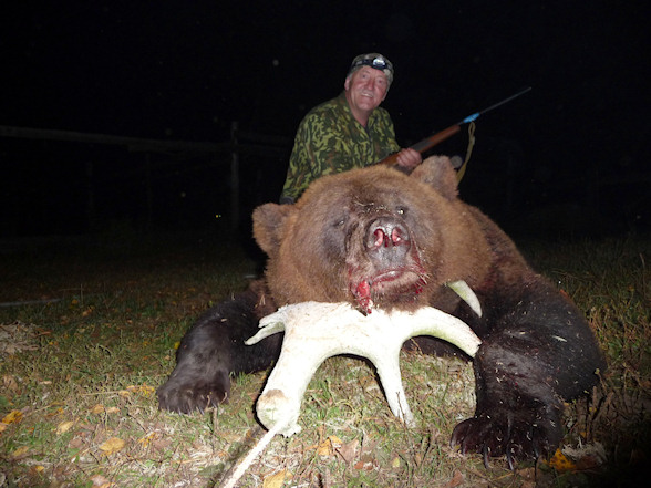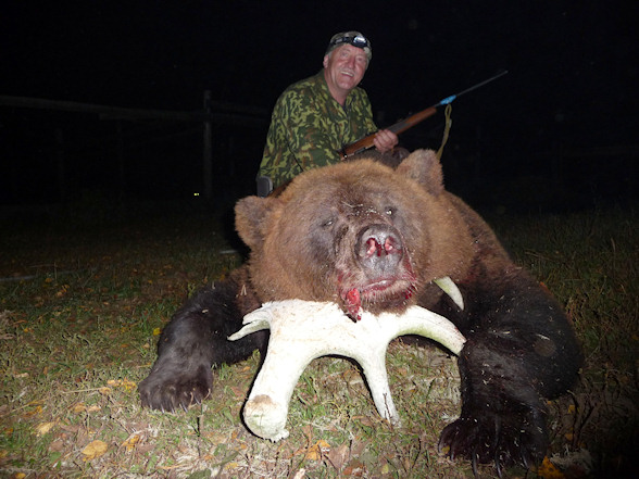 Weit weg davon sitze ich nun wieder auf einem etwa 2,5 Meter hohen schaukelnden Birkenbaumsitz, wieder ein kleines Haferfeld vor mir und schaue noch der Sonne ins Gesicht. Geduld ist gefragt. Nach zwei Stunden taucht die Sonne im Westen ab und hinterlässt ein feuerrotes Horizontbild. Hier im russischen Urwald sieht das aus wie aus einem Jurassic Park–Film. Gegen 20.00 Uhr höre ich etwas anwechseln: Holz bricht irgendwo und 40 Meter links neben mir auf 9 Uhr sehe ich einen braunen Bärenkopf aus dem Dickicht des Waldrandes herausschauen. Die rechte vordere Pranke folgt und bevor sie den Boden berührt, zieht der Bär sie schon wieder zurück. Der Bärenkopf verschwindet ebenfalls und die Geräuschkulisse vom Anwechseln weicht dahin zurück, wo sie hergekommen ist. Der Wind hat mich verraten. Säuselnd zieht er meinen Geruch genau dort hinüber, wo der Bär heraustreten wollte. Mann! Ich bin etwas geschockt und gleichzeitig enttäuscht. Nun esse ich erstmal den Bounty- Riegel, ziehe mich warm an und entspanne mich so gut es geht. Später geht der Mond auf. Leicht bewölkt kämpft sich sein Licht herunter, es bleibt duster und kalt. Meine Waffe dient auch als Beobachtungsobjektiv. Gegen 22.00 Uhr drehe ich mit der Visierung wieder eine Runde auf meinem Repetierer und - mir stockt der Atem. Weit draußen auf 9 Uhr am Waldrand steht ein Bär und prüft den Wind. Groß und mächtig saugt er mit erhobenem Haupt die Luft ein. Jetzt gilt es schnell und präzise zu sein. Die Waffe ist schon im Anschlag und gleich gespannt. Wo anhalten? Dies ist ein Bär! „Gnade dir Gott, wenn du den nicht tödlich triffst und nachsuchen musst“, rauscht es mir durch den Kopf. Also, aufs Blatt zielen. Wieder verlässt eine .30.06-Kugel den Lauf meiner Waffe und der Bär brüllt noch an Ort und Stelle beim Zusammenstürzen. „Was hast du jetzt gemacht?“, denke ich. Der Bär liegt da und brüllt, dass es nicht auszuhalten ist. Seine Hinterbeine zucken in der Luft, etwa zwei Minuten lang, dann wird es still. Ich traue dem Frieden nicht. Das dunkle Etwas bleibt aber Gott sei Dank da draußen liegen. Ich bilde mir ein, im Mondlicht die Konturen zu erkennen. Nervös bleibe ich sitzen und als gegen 23.00 Uhr die Lichter des Lkws auftauchen, gebe ich dem Fahrer ein Zeichen, im Auto zu bleiben. Ich schreie „Mischka-Mischka“, was auf Russisch Bär heißt, in seine Richtung. Der versteht sofort was ich meine. Ich baume ab, hole mit der schussbereiten Waffe die zwei russischen Laikas (Huskies) von der Ladefläche des Lkws und lass sie laufen. |