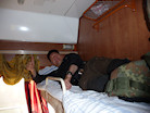 | Die Reise dauert über 18 Stunden, aber wir gönnen uns ja auch sonst nie was.„Zusammengeschweißt“ sitzen wir palavernd die Zeit ab, und wenn einer von uns vier „Jagdtouris“ vom Pinkeln ins Abteil zurückkommt, sieht man schon deutlich, wie dessen Stirn in Falten liegt und ein tiefes Luftholen sorgfältigst vermieden wurde. |