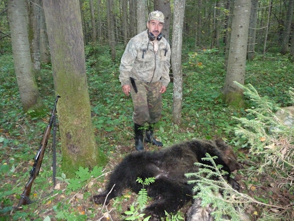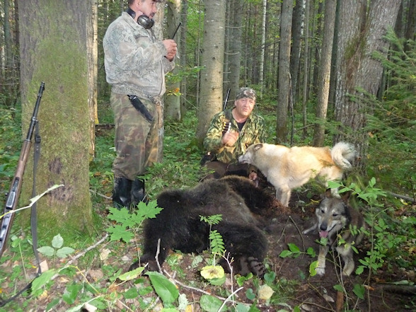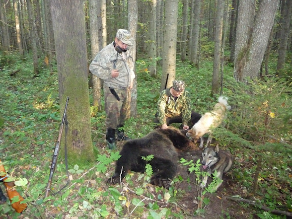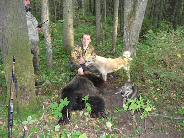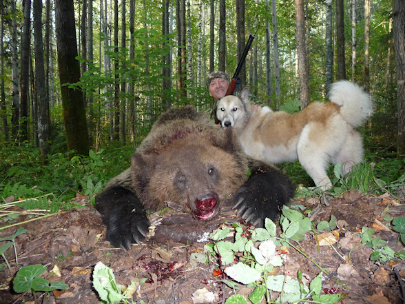 Die Hunde werden auf diese Spuren angesetzt und freigelassen. Schon verschwinden sie mit lautem Gebell in den Dickungen und wir zu dritt sofort hinterher. Sergey 1, Wladimir und ich rennen was das Zeug hält. Oftmals verliert sich das Gebell als Orientierung. Kurz stehen bleiben und die neue Richtung ausloten, dann geht es weiter. Wladimir hört nicht mehr gut und hat deshalb einen Kopfhörer auf, durch den die Akustik verstärkt wird und der auch von deutschen Jägern oftmals verwendet wird. Nach mehreren Kilometern und etwa zweieinhalb Stunden später wird das Gebell deutlicher. Alle sind wir außer Puste und im Stehen orientieren wir uns neu nach der genauen Richtung. Wladimir wundert sich über meine Kondition und erkundigt sich bei Sergey 1. Dieser erzählt ihm etwas von einem „trainierten Alpinisten“. Das ist wohl etwas übertrieben, aber Wladimir fragt nicht weiter nach. Dann 50 Meter vor uns haben die Hunde etwas gestellt. Ich muss näher ran. Von weitem sehe ich die Hunde um ein braunes bewegtes Fellbüschel herumspringen.„Es ist ein Mischka“, sage ich zu Wladimir, der sofort über Sergey 1 ausrichten lässt, ich solle ihn erlegen. Aber ich solle ja nicht schießen, wenn seine Hunde herumspringen und auch nicht, wenn einer hinter dem Bär in meinem Kugelfang sein könnte. Die Kugel könnte gegebenenfalls durchschlagen und dann sei der Hund tot. Ich höre schon nicht mehr hin, für was habe ich in Deutschland eine solide Ausbildung gemacht? Und so pirsche ich mich heran. Sergey 1 sucht sich einen Baum zum Hinaufklettern. Er hat keine Waffe dabei. Bis auf 20 Meter komme ich heran, der Bär hat mich längst in der Nase und versucht von den Hunden loszukommen. Er schlägt und beißt um sich, aber eine Schussmöglichkeit ergibt sich nicht. Nur nicht nervös werden, denke ich und bin mir meiner Überlegenheit sicher. Eine Jagd, von der man sonst nur träumen kann! Da steht der Bär auf. Ich ziele auf seinen Hals, bin sicher, dass ich keinen Hund gefährde. Krachend verlässt das Geschoss den Lauf meines Gewehrs und der Bär taumelt. Er stürzt zu Boden und die Hunde zerren schon an ihm. Ich repetiere sofort nach, meine Knie werden wieder stabil. Wladimir kommt heran und zu zweit gehen wir auf das Tier zu. Der Bär liegt am Boden. Er öffnet nochmals seine Augenlieder, doch Sekunden später rollt er die Augen nach unten. Er ist tot. |