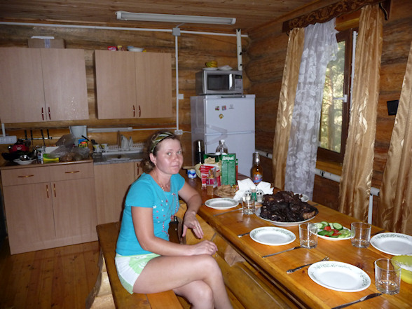 Ich genieße diese jagdlichen Wanderausflüge. Wir kommen jede Nacht müde zurück. Danach eine russisch Banja und der Tag klingt mit Bergen von gekochtem oder gebratenem Bären- und Keilerfleisch aus. |
