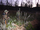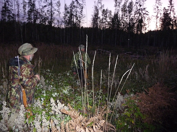 Wladimir platziert mich so, dass ein brunftiger Hirsch theoretisch an mir vorbei kommen muss, wenn er seinen Kontrahenten sucht. Das bedeutet, ich warte an einer Stelle, an der möglichst von drei Seiten Geländeübersicht besteht, sei es durch Wegkreuzungen, natürliche Waldlichtungen oder Kahlschläge durch den Staatsforst. Wladimir geht dann gegen die vermutete Ankunftsrichtung des Elchs hinter mir in den Wald, brüllt mehrere Male den Brunftschrei in die Nacht, bricht Äste und knackt herum, als wenn ein leibhaftig Testosteron gesteuerter Elch toben würde. Eigentlich müsste nun der Platzhirsch an mir vorbei kommen, um seinen Nebenbuhler zu stellen. So ist es gedacht und – naja - theoretisch wäre es dann sein letzter Gang. Die Methode hat sich hunderte Male schon bewährt. Nur bei uns klappt es nicht. Ein paar Mal hören wir einen Elch antworten, wechseln dann sofort unsere Stellung und gehen auf ihn zu, wenn es der Wind zulässt. Viele Nächte sind wir auf diese Art da draußen und stiefeln durch herrliche Landschaften. Mal laufen die Bergschuhe voll mit morastigem Wasser oder wir kommen so verstochen nach Hause, dass unser Spiegelbild aussieht, als ob wir aufgrund der verschwollenen Gesichter pubertierende Teenager wären. |