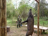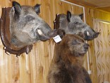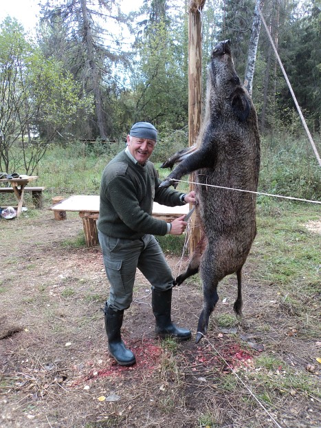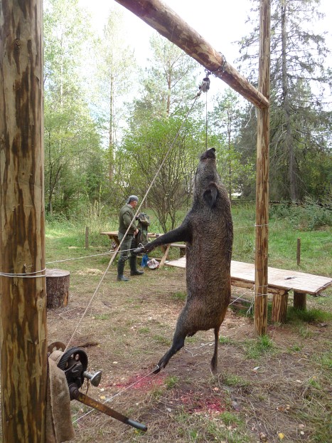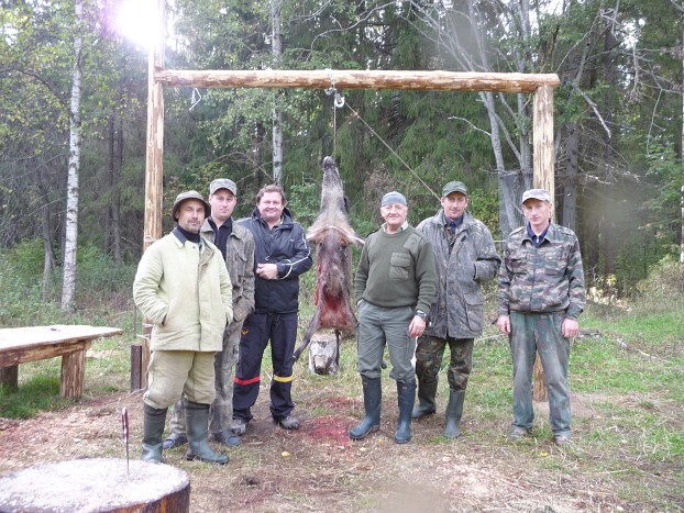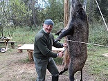 | Nach etlichen erfolglosen Tagen hat auch der Chef Zeit für uns und Wladimir nimmt mich mit zu seinem morgendlichen Stöber (oder Hetzspektakel). Einige seiner Spürhunde setzt er irgendwo im Gelände auf frisch gefundene Spuren an und lässt sie laufen. Schnell findet sich das Alpha-Tier unter den Huskies und übernimmt erkennbar die Führung. So verfolgen die Hunde unerbittlich ihre warme Spur. Uns Jägern bleibt dann nur hinterher zu kommen. Heute erwischte es eine Sau, etwa 80 Kilo schwer. Es war gar nicht so leicht, der allein ziehenden Bache mit meiner Schrotflinte und den Brenneke-Geschossen auf den Leib zu rücken, Die Hundemeute lies kaum Zeit für lange Schussüberlegungen, so 30 Meter vom Objekt entfernt. 3 Treffer strecken die Sau zu Boden und unser täglicher Speiseplan war von nun an mit gekochtem oder gebratenem Saufleisch noch üppiger denn je. |