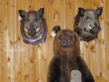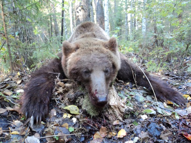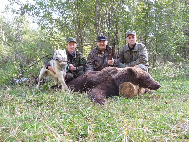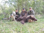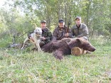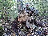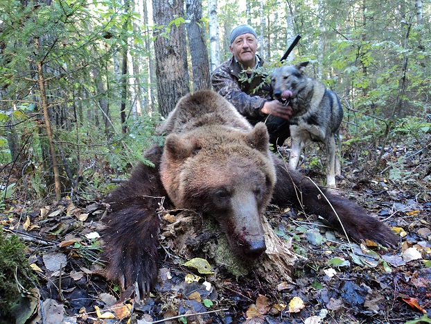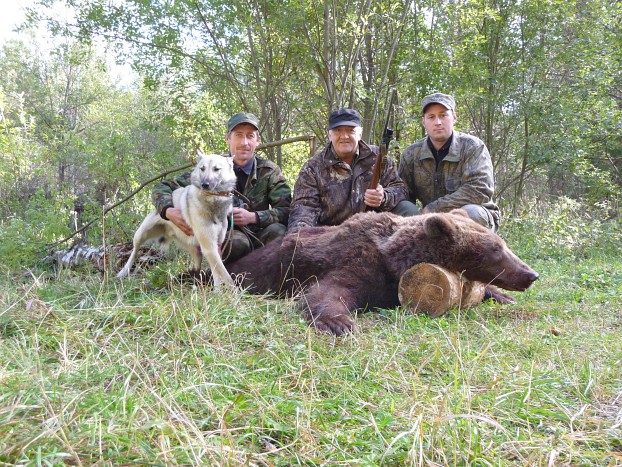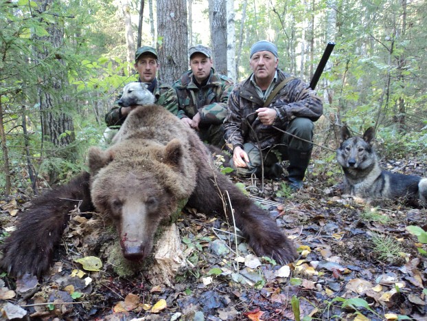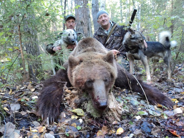 Am nächsten Tag, so übersetzt mir Sergey, soll es noch mal losgehen - wie heute auf Hetzjagd, aber ob wir auf diese Art einen Elch zu Gesicht bekommen? Ich sage zu - Nach den erfolglosen Lockjagden bin ich froh, wenigstens so wie heute auf eine Sau zu treffen. Bei diesigem Nebel, am frühen Morgen und bei Minus 2 Grad (hier schon im September!) geht’s los: Aufgesessen auf den russischen Uaz, fahren wir zu Dritt raus auf ein Feld, das mit extra ausgebrachten Haferhaufen, nachts für ein „Wirr-Warr“ an Spuren gesorgt hat. Mich interessieren hauptsächlich Schwarzwild-Spuren, ein reifer Keiler wäre mein Lieblingswild. Wladimir erklärt mir die Abdrücke im sandigen Feldboden: Es finden sich Bär-, Elch- und auch Wolfspuren, aber hauptsächlich Schwarzwildspuren sind an den zerwühlten Haferhaufen auszumachen. Wladimir lässt die Hunde von der Leine und der mehrmals prämierte Rüde „Schoroch“ übernimmt nun das Kommando. Wieder habe ich nur eine alte Schrot(t)flinte dabei und die Taschen voller Brenneke, die Kugellaufwaffen der ansässigen Jägerschaft sind bereits an andere Jäger ausgegeben oder einfach nicht einsatzfähig! Gut zu Fuß bin ich ja „Gott sei dank“; denn es ist nicht gerade leicht mit den geübten Waldläufern mitzuhalten. Querfeldein renne ich nun mit den beiden Jagdprofis hinter der Hundemeute her. Sie geben dauernd Spurlaut, daher ist es leicht, immer wieder die Richtung zu finden. Bin ja mal gespannt, was die da aufgestöbert haben? Nach 2 Stunden Hetze wird das Gebell hitziger und da wird klar, sie sind am Ziel ihrer Verfolgung, die Beute ist gestellt! Artöm muss nun zur eigenen Absicherung zurückbleiben, Wladimir und ich pirschen uns heran, bis auf etwa 70 Meter. Hier wartet jetzt Wladimir, er hat einen Simonow - Selbstladekarabiner dabei, der aber nur Einzelschüsse abfeuern kann - Auch in Russland ist Dauerfeuer bei der Jagdausübung verboten! Nun ist es an mir, wie gestern, die gestellte Jagdbeute der Hunde zur Strecke zu bringen. Noch weiß ich nicht, was mich da vorne erwartet, und so versuche ich, geduckt gegen den Wind näher heranzukommen. Die Vegetation ist zu üppig, ich sehe einfach nicht, was da vorne los ist ... Daher überlege ich, auf einen Baum zu steigen, aber wie soll ich von da dann schießen? Schnell verwerfe ich den Gedanken wieder. Das Gebell ist nun deutlich vor mir und da vernehme ich - plötzlich erschrocken - ein tiefes Brummen, das in einem knurrigen Laut endet. „Oh, Scheiße, das muss ein Bär sein!“ trifft es mich, ein Keiler macht andere Geräusche. Nach ein paar Minuten, habe ich das braun–schwarze Fell-Knäuel im Sichtfeld, etwa 30 Meter trennen mich von ihm. Die vier Hunde tanzen bellend um den Bär herum und meine Schrotflinte ist in beiden Läufen geladen und gespannt. Nur einen Teil des stehenden Bärs kann ich momentan sehen, ich ziele hinter das Blatt, da drängt sich ein Huskiekörper dazwischen - und jetzt ...? Gerade ist die Sicht wieder frei, ich drücke ab, aber das Schloss für den oberen Lauf schlägt nicht ab. Nicht gespannt? Jetzt nur nicht nervös werden; nochmal spanne ich die Flinte und nehme den hinteren Abzug für den unteren Lauf. Das Spiel beginnt von neuem. Plötzlich schlägt der Bär nach einem Huskie und jagt ihn zugleich etwa 2o Meter nach rechts in eine Dickung. Kurz bleibt der Bär stehen - und „Bumm“ steuert das erste Geschoss seinem Ziel entgegen. Der Bär zeichnet nicht mal und schaut jetzt herüber zu mir, ich bin gerade mal 25 Meter entfernt. Ich lade den unteren Lauf und spanne - der obere funktioniert ja nicht. Mann, hätte ich bloß diese Knarre Probe geschossen, zwei mögliche Schüsse hintereinander, geben einfach mehr Sicherheit! Ich bin mir nicht sicher, ob der Bär jetzt von Angesicht zu Angesicht seinen wahren Feind erkannt hat, und mein Puls rast in die Höhe. Der Bär schlägt wieder nach den Hunden und erneut verlässt eine Brenneke den Lauf meiner Flinte. Habe ich getroffen? Schon bin ich wieder am Laden, schaue über den Lauf und fokussiere den Bärenkörper über das aufgesetzte Balkenkorn. Der Bär steht leicht spitz und die losgelassene Brenneke faucht in den Hals des Bären da vor mir. Er steht noch, als ob diese Geschosse keine Wirkung haben, für diesen mit Adrenalin aufgepeitschten und wohl Todesangst gepeinigten Bären. Die Hunde bellen und fahren um den Bären herum, was das Zeug hält. Abrufen kann man sie an so einer Beute nicht mehr, sagen die Jäger, so was gibt’s hier nicht. Da kommt Wladimir geduckt heran, er macht sich wohl Sorgen. Ich nehme seine Simonow und gebe auf den Hals des Bären noch mal zwei Schüsse ab. Er steht immer noch, wankt aber hin und her. Jetzt fällt er und schon zerren die Hunde an ihm. „Mein Gott“, das war ein Spektakel. Nachdem der Bär im Jagdhof zerwirkt und das Fell abgezogen wird, kommen die Brenneke Treffer zum Vorschein. Zwei gegenüber liegende große Ausschüsse lassen den Schluss zu, dass der Bär, als er sich drehte, auf der anderen Seite in den Schusskanal der ersten, die zweite Brenecke abbekommen hat. Die letzte Bleikugel führte quer durch den Halsbereich und auch ein 7,62mm- Simonow-Geschoss landete als tödlicher Treffer im Hals des etwa 8 Jahre alten Bären, der weit über 200 Kilo wiegt. Ich wundere mich, dass ich trotz meiner Angst in dieser Jagdsituation nur einmal, wohl mit der Simonow daneben geschossen habe, und es reicht mir mit Bärenjagd. |