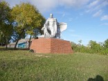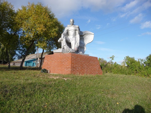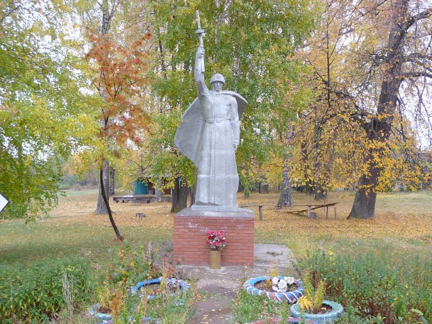 | Der große Vaterländische Krieg ist immer noch sehr gegenwärtig: Statussymbole in Form eines siegreichen fahnenschwenkenden Soldaten stehen beinahe in jedem Dorf (wie hier neben der Kirche) und zeugen von der einstigen politisch-motivierten kommunistischen Weltmacht Russlands. Längs sind die Zeiten andere, aber hier im Dorf und in ihrer ländlichen Umgebung ist sie (leider) noch nicht angekommen. |