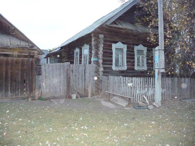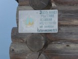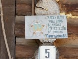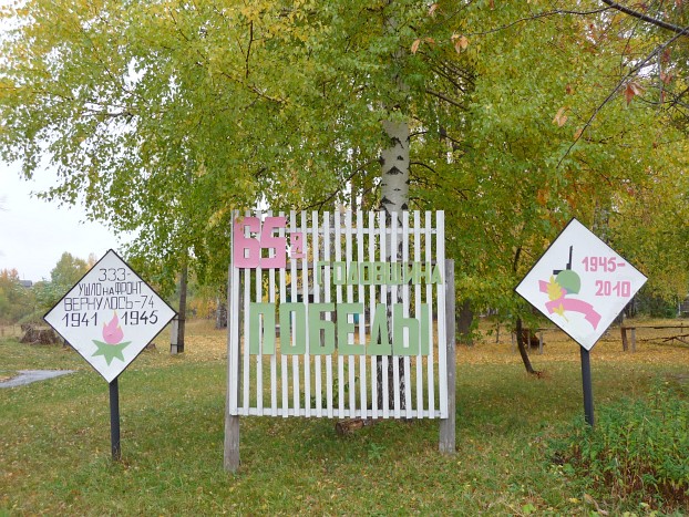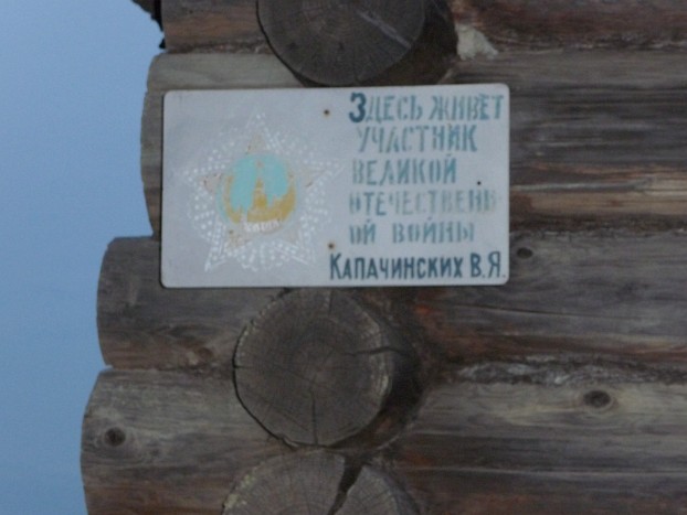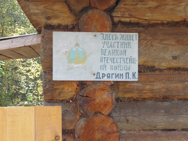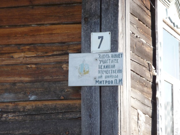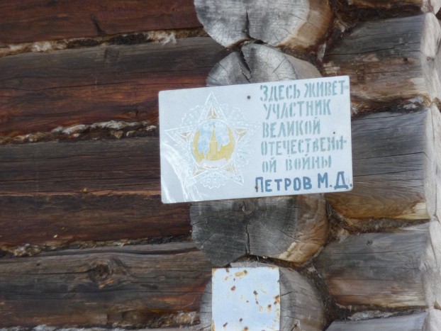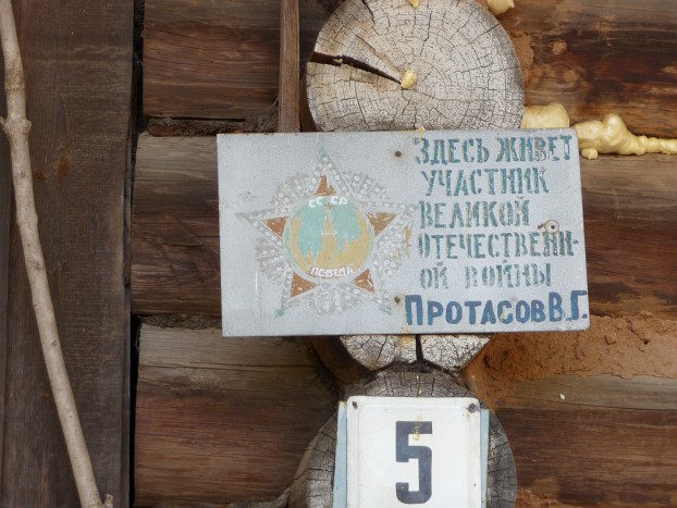 | Noch hängen viele Schiefertafeln an den Fassaden der Holzblockhäuser mit dem „Udmurtischen Wappen“ und der Aufschrift „Hier wohnt ein Teilnehmer unseres großen Vaterländischen Krieges“; darunter dessen Name, Vor- und Vatersname. Aber die Farben sind schon sehr verblasst und die Träger dieser Auszeichnung leben womöglich gar nicht mehr. |
