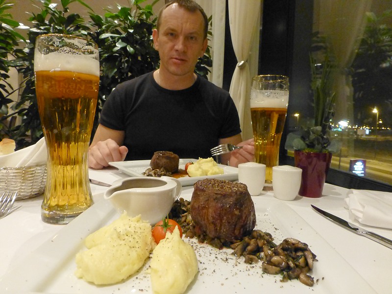 Im Hotelrestaurant trinken Sergey und ich zum inneren Aufwärmen ein Bierchen, bestellen Steak mit Salat und Kartoffelbrei! Welch ein Wahnsinn, das Steak schmeckt mir so gut, dass ich gleich noch ein Zweites verdrücke, einfach um den Geburtstag in vier Tagen kulinarisch schon mal hinter mich zu bringen.