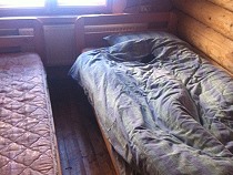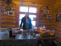 | Nächsten Morgen ist "der Ofen aus". Bei knapp über null Grad steige ich frierend aus meiner Koje! Gleich zum Ofen um mich zu wärmen, schaue ich unserer Köchin Lena über die Schulter, die gerade Blinis (Pfannkuchen) zubereitet. Nach etwa 7 Stück direkt aus der Pfanne auf die Hand, fangen meine Lebensgeister an unruhig zu werden. Vielleicht sind es auch die in den Genen behafteten Urinstinkte eines Jägers, die mich rauslocken in die russische Taiga. |