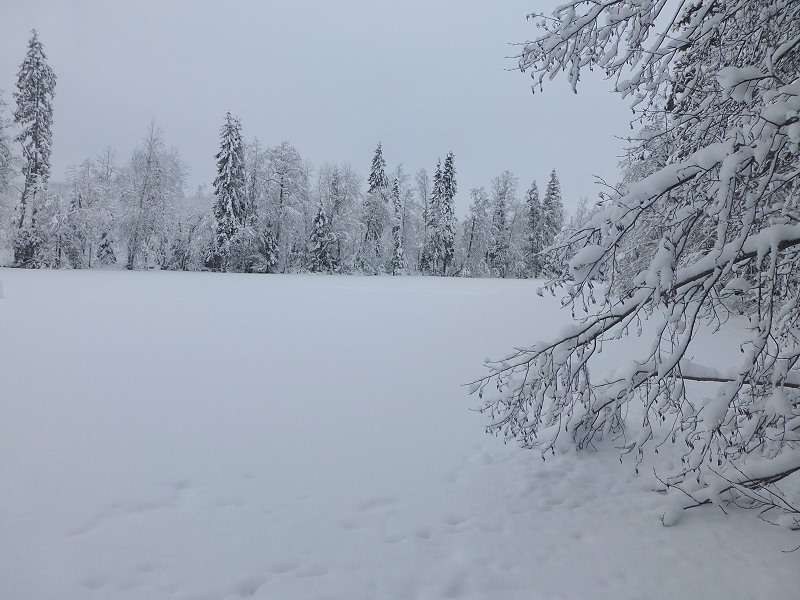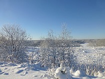 | Aber das Terrain ist gefährlich und tückisch für Menschen. Wir überqueren zugefrorene Seen und es knirscht und knackst an den Ufern, vor allem die Moorgebiete sind nur von einer etwa 20 - 30 Zentimeter dicken Schneeschicht zugedeckt, mit darunter liegenden, zum Teil schwimmenden Binsen- oder ähnlichen Sumpfgewächsen. |