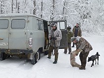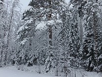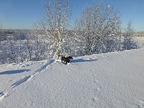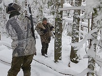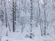 | Heute Morgen hat es draußen minus 25 Grad und der eisige Wind raubt mir erstmal den Atem, als ich mich mit Sergey und Alex auf den Weg mache nach Spuren zu schauen, denn gleich hinter dem Jagdhaus beginnt die eisige Welt des Karelischen Urwalds mit seinen tausenden kleinen Seen und den tückischen Moorgebieten, die übergehen in dichte undurchdringliche Waldgebiete und kaum kultivierbar sind. Ein Paradies für die Tierwelt, angeführt von Bär, Wolf und Luchs auf der Jägerseite, die hauptsächlich Elch, Birk, Auerhahn und den Schneehasen auf ihrer Beuteliste haben. Auf Letzteren hat es auch der Luchs abgesehen. Schwarzwild gibt es hier kaum. |