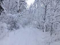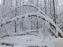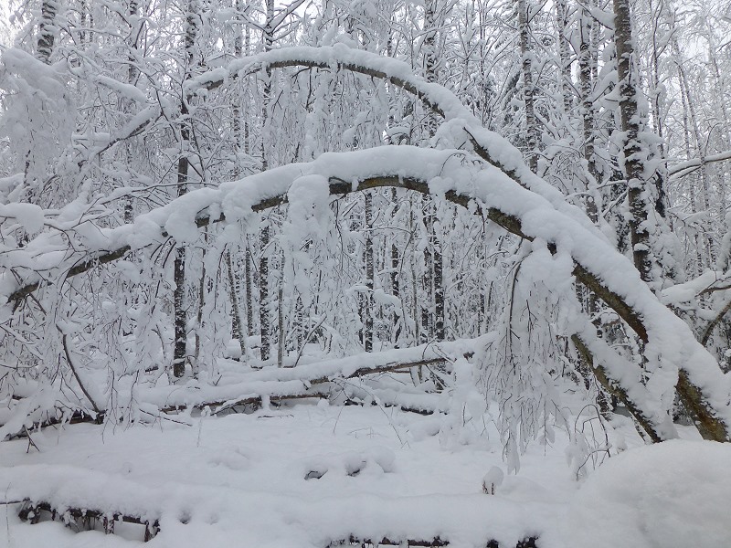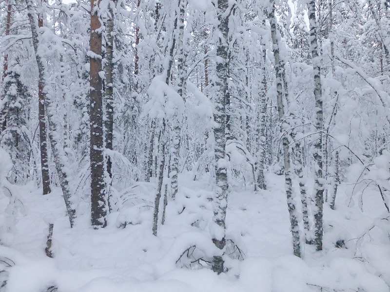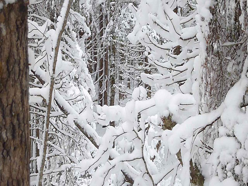 Trotz der 28 Grad Minus fange ich nach einer halben Stunde Verfolgungsjagd an zu schwitzen. Eindringender Schnee von den mit Schnee überladenen Ästen sorgen für kalte Duschen, wenn sie ihre weiße Pracht beim unten Durchschlüpfen herabregnen lassen! |