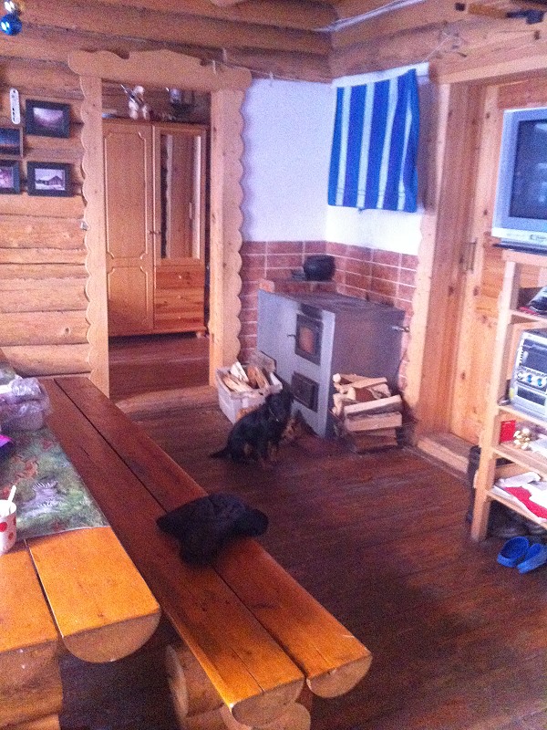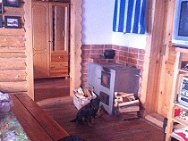 | Victor, der Hausherr, ein etwas gedrungener aber mit wachen Augen ausgerüsteter End-vierziger, erwartet uns schon. Als wir in die gute Stube einrücken, versucht gerade die versprochene „Köchin“ den russischen Holzofen anzufeuern. |