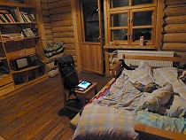 | Die Tage vergehen, mittlerweile bin ich umgezogen in das obere Zimmer. So ist es morgens nicht ganz so kalt weil es über der russischen Stube liegt und der Kamin noch lange nach dem Ausgehen des Feuers nachts das Zimmer wärmt. Allerdings ist ein Hinaufkommen oder Heruntersteigen auf der steilen und rutschigen Treppe weitaus risikovoller als die gesamte Jagd. Ich habe Angst mir den Hals zu brechen und vermeide jedes unnötige Verlassen meines oben liegenden Domizils! |