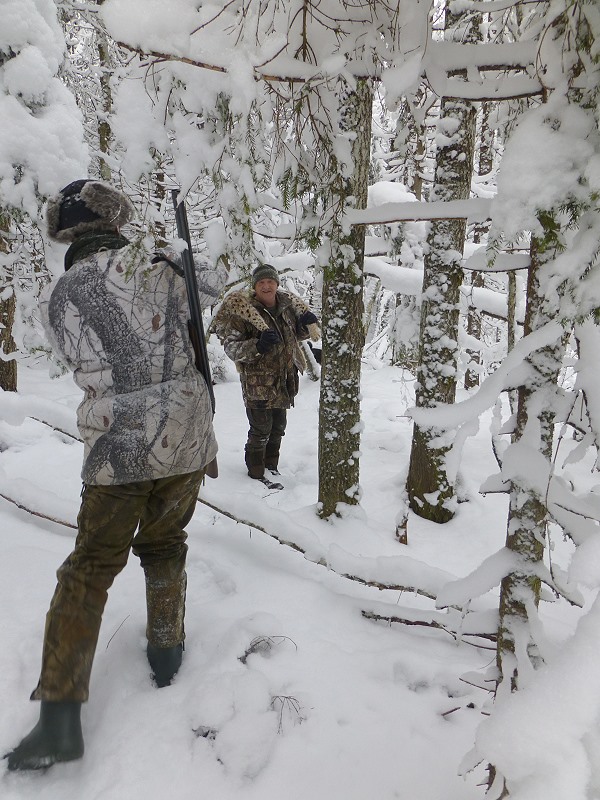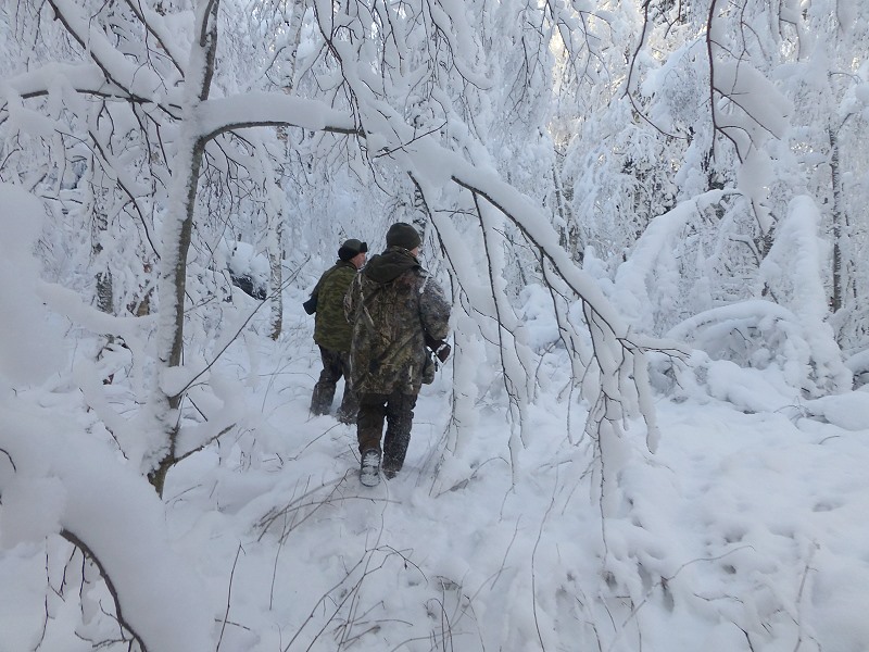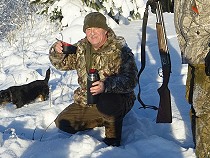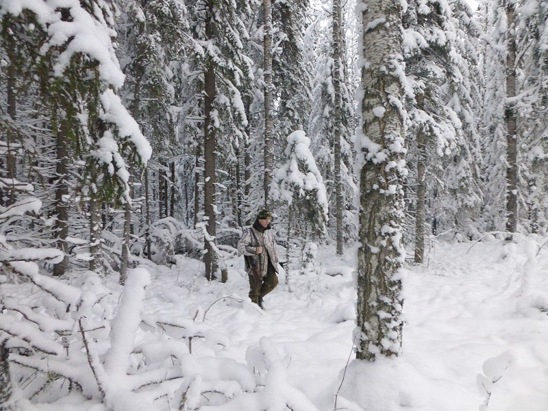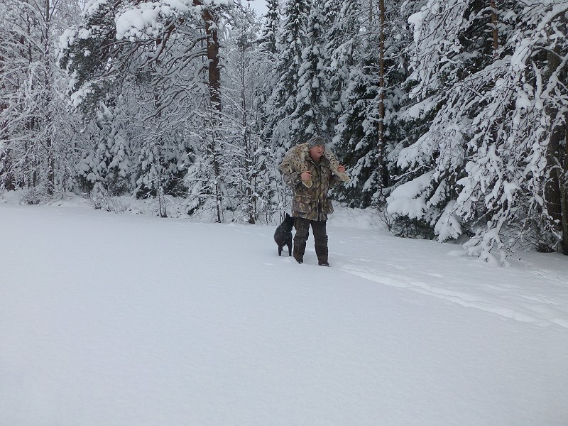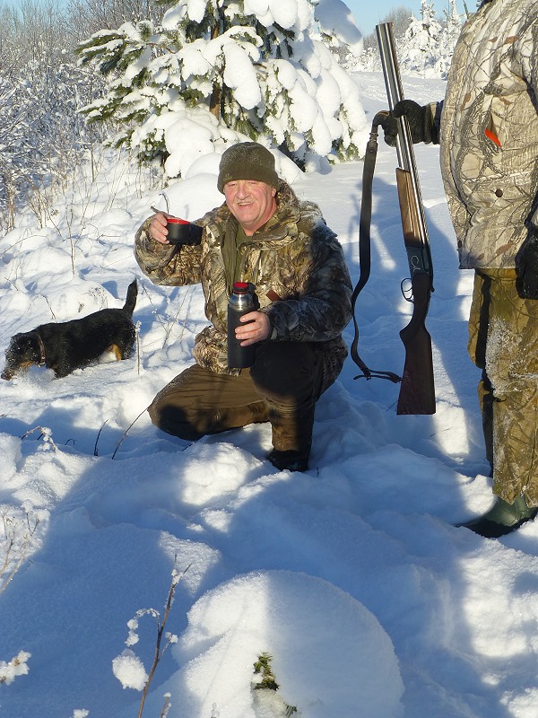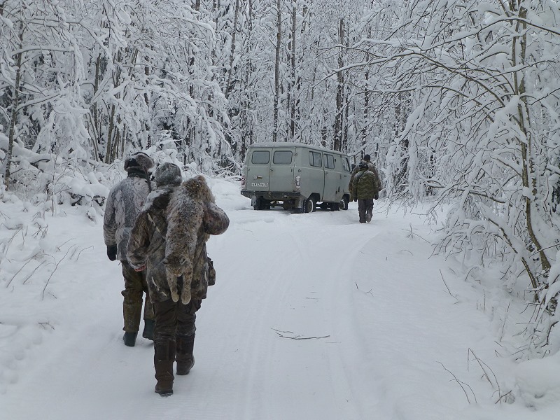 Meine doppelläufige Ich 27 Baikal Schrotflinte hängt, wie bei der Bundeswehr gelernt, quer über meiner Schulter, das gibt mir Bewegungsfreiheit, um den abgeleinten Hunden auf der frischen Luchsspur zu folgen. Die Taschen habe ich voller Schrotmunition vom Kaliber 12/70. Sergey trägt meinen Jagdrucksack mit Ersatzhandschuhen und wichtig - meine volle Thermoskanne mit schmackhaftem Pfefferminztee! Es kann losgehen!